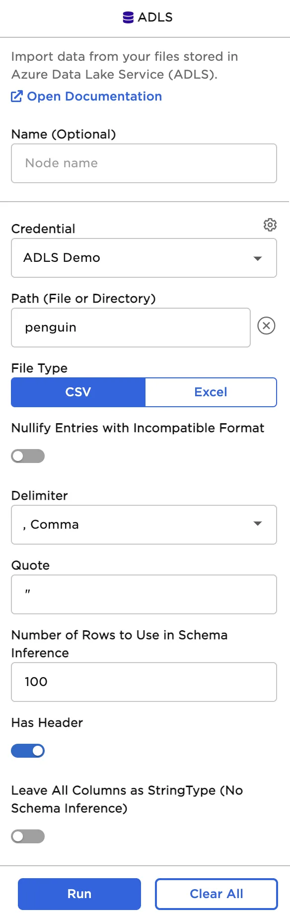 | Leave all columns as StringType (no schema inference) Default: Off | String data type Toggle this switch on to read all columns as strings and upload all values. |
