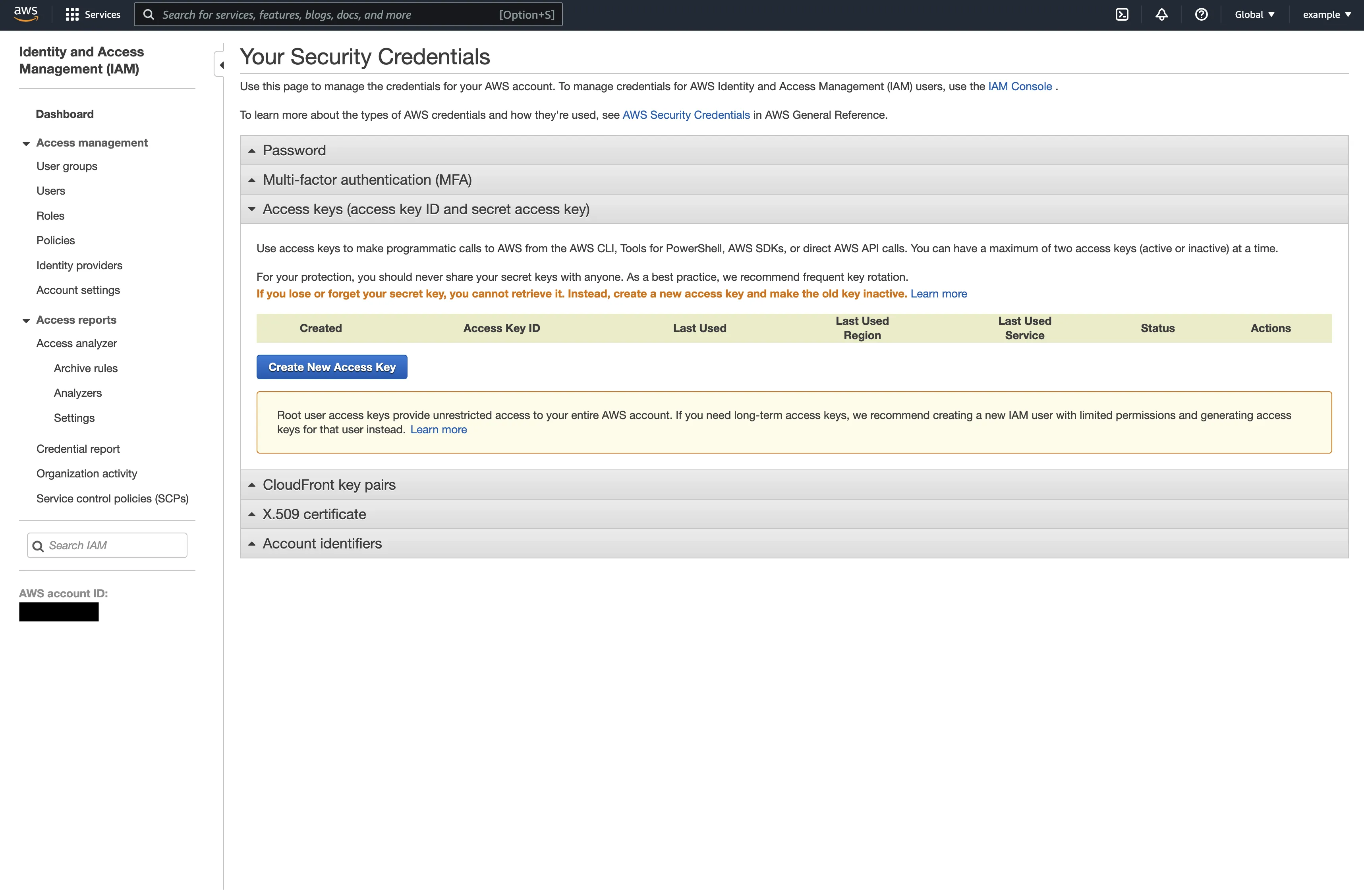 - Select the Access keys (access key ID and secret access key) section