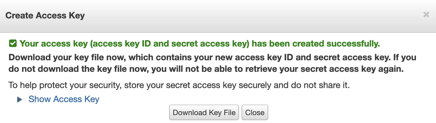 You must add an access key and AWS secret key to use the S3 node. Follow the steps below to generate these keys. For more information, see the AWS documentation