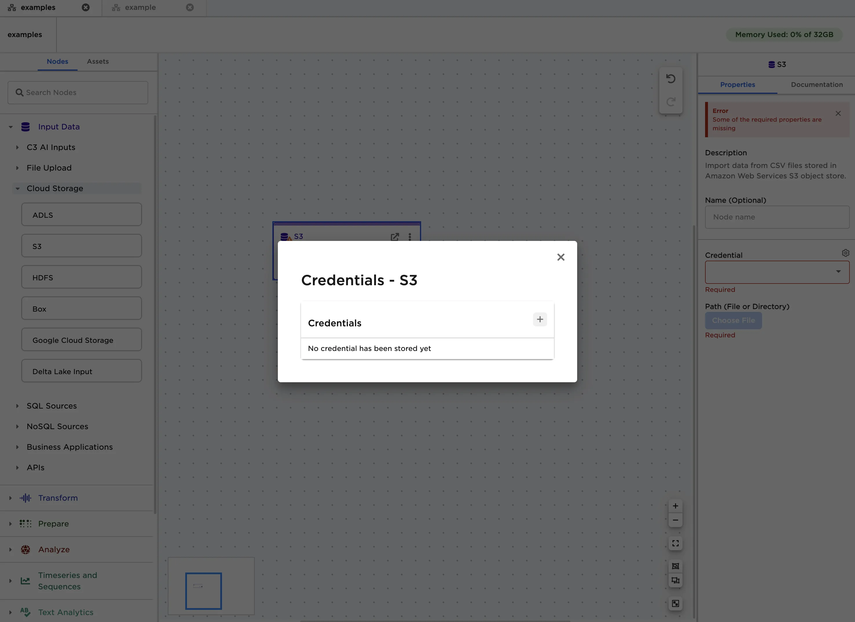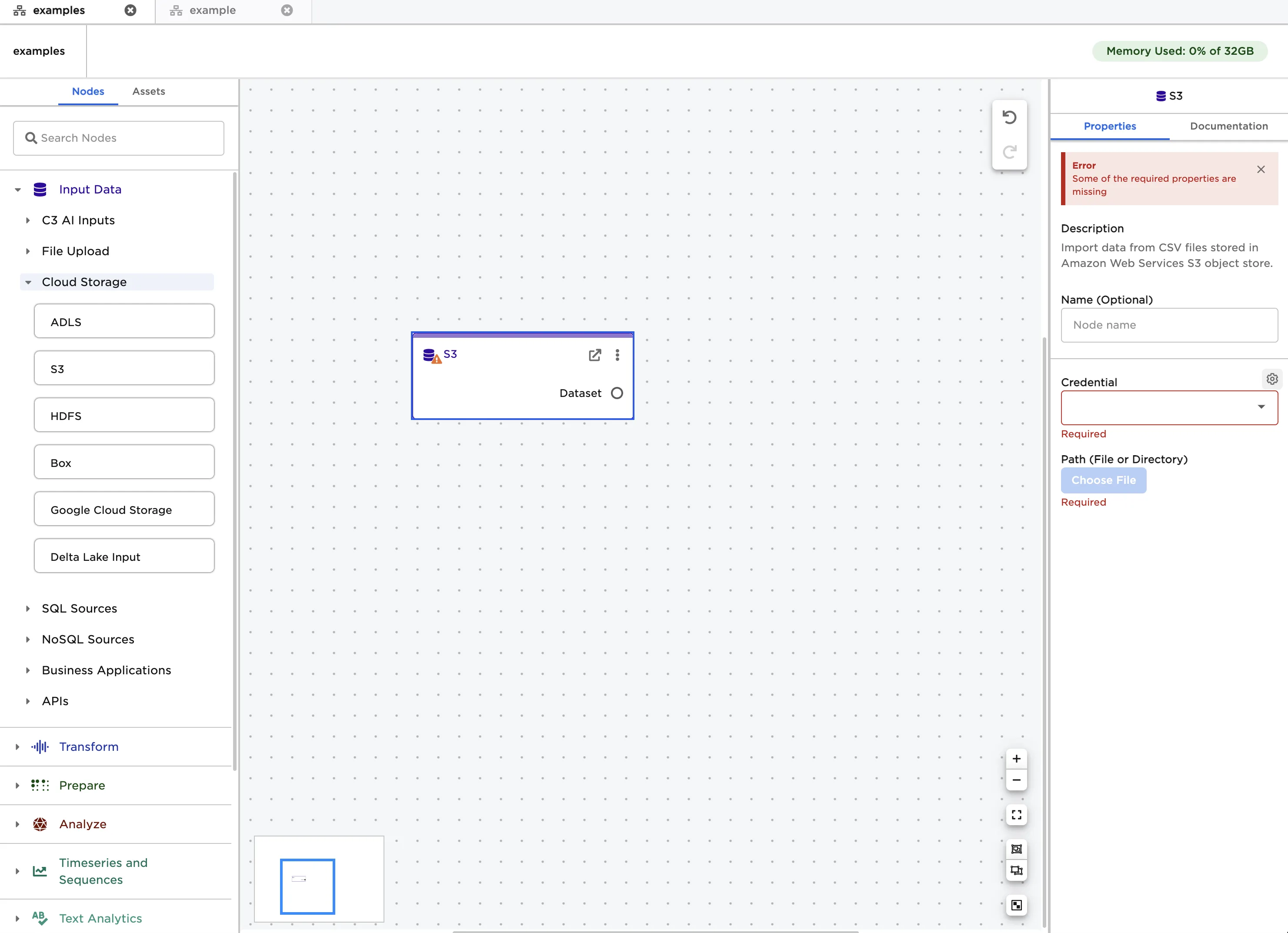 - Drag an S3 node onto the Visual Notebooks workspace