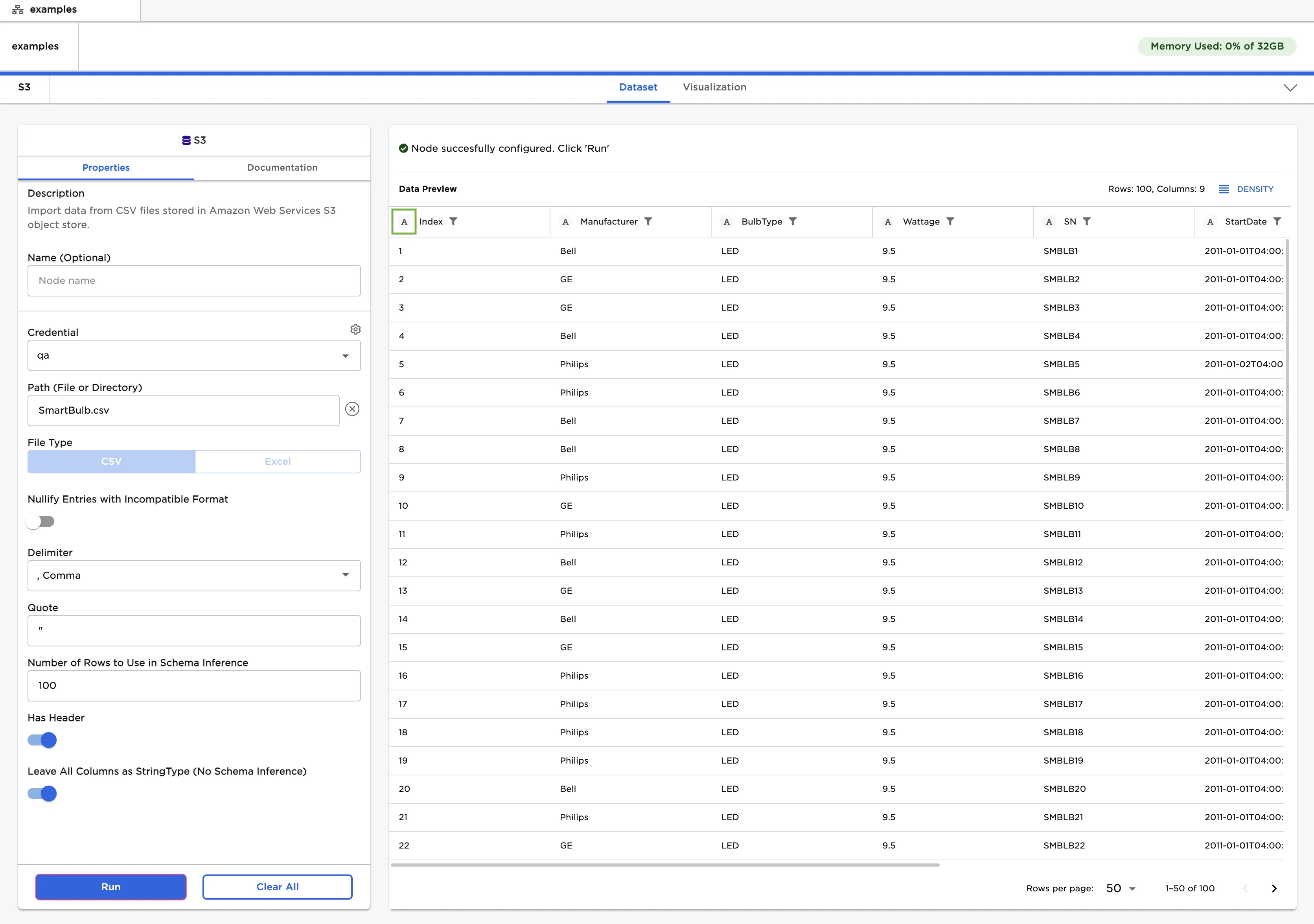 - Select "Run" to create a dataframe with the default settings.