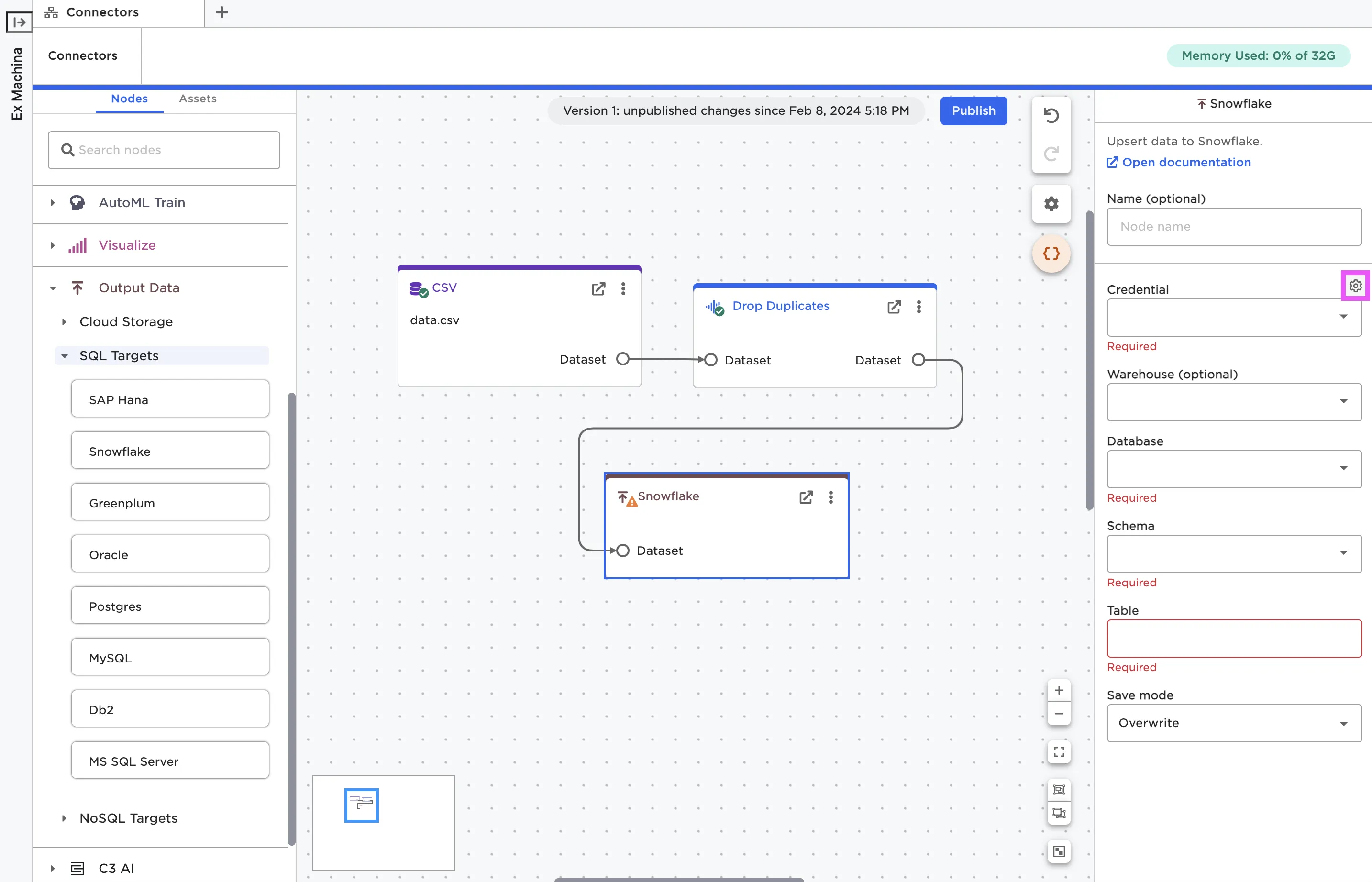 Once you've identified the node that corresponds to the source you'd like to export to, drag the node onto the canvas. For example, if you wanted to export data to Snowflake, drag a Snowflake node onto the canvas. Connect the output node to an existing node, then configure the node using the sidebar or double click on the node to open it in a full-screen view.