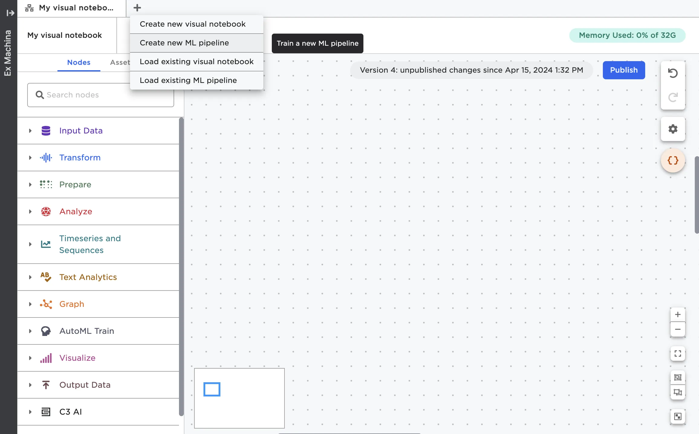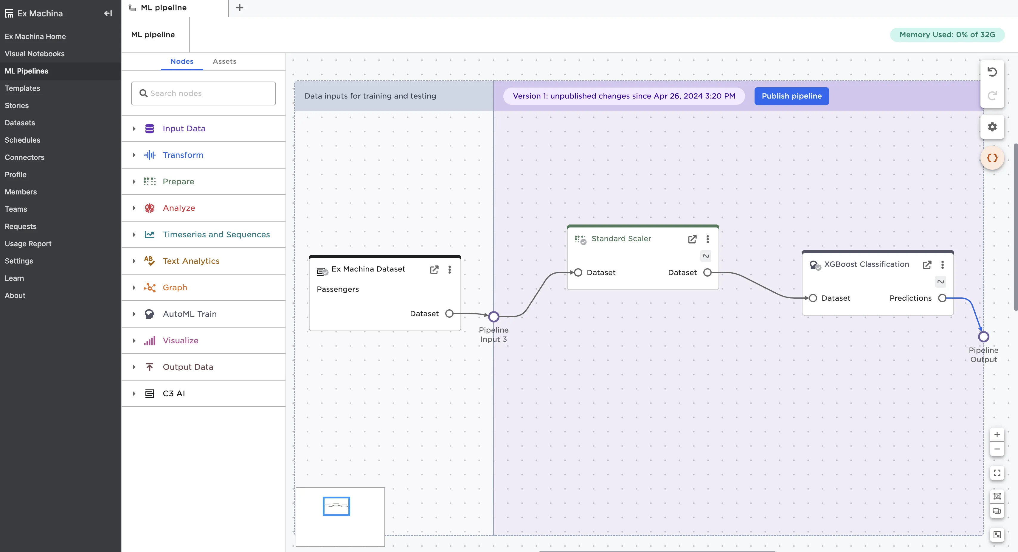 Most importantly, ML pipelines allow you to save trained models and create a model registry. Published pipelines appear in the assets panel of the node palette where they can be used across projects. Pipelines are versioned and linked to the specific dataset used to create the pipeline.