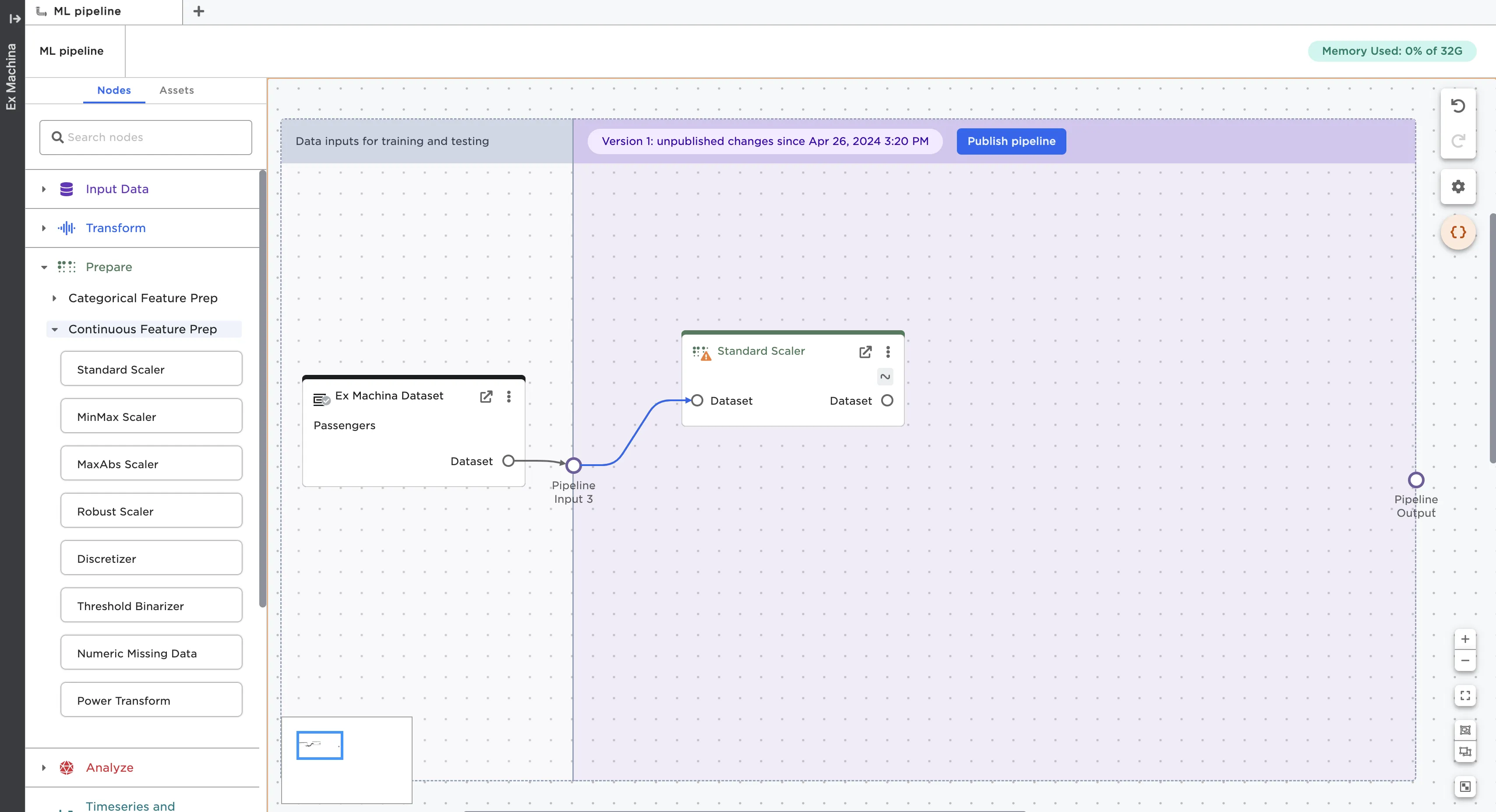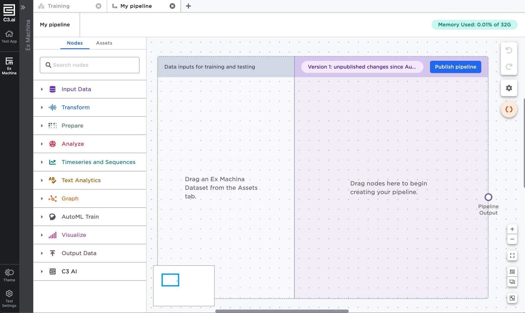 To start building a pipeline, drag nodes into the purple section of the pipeline and connect them to the pipeline input ports.