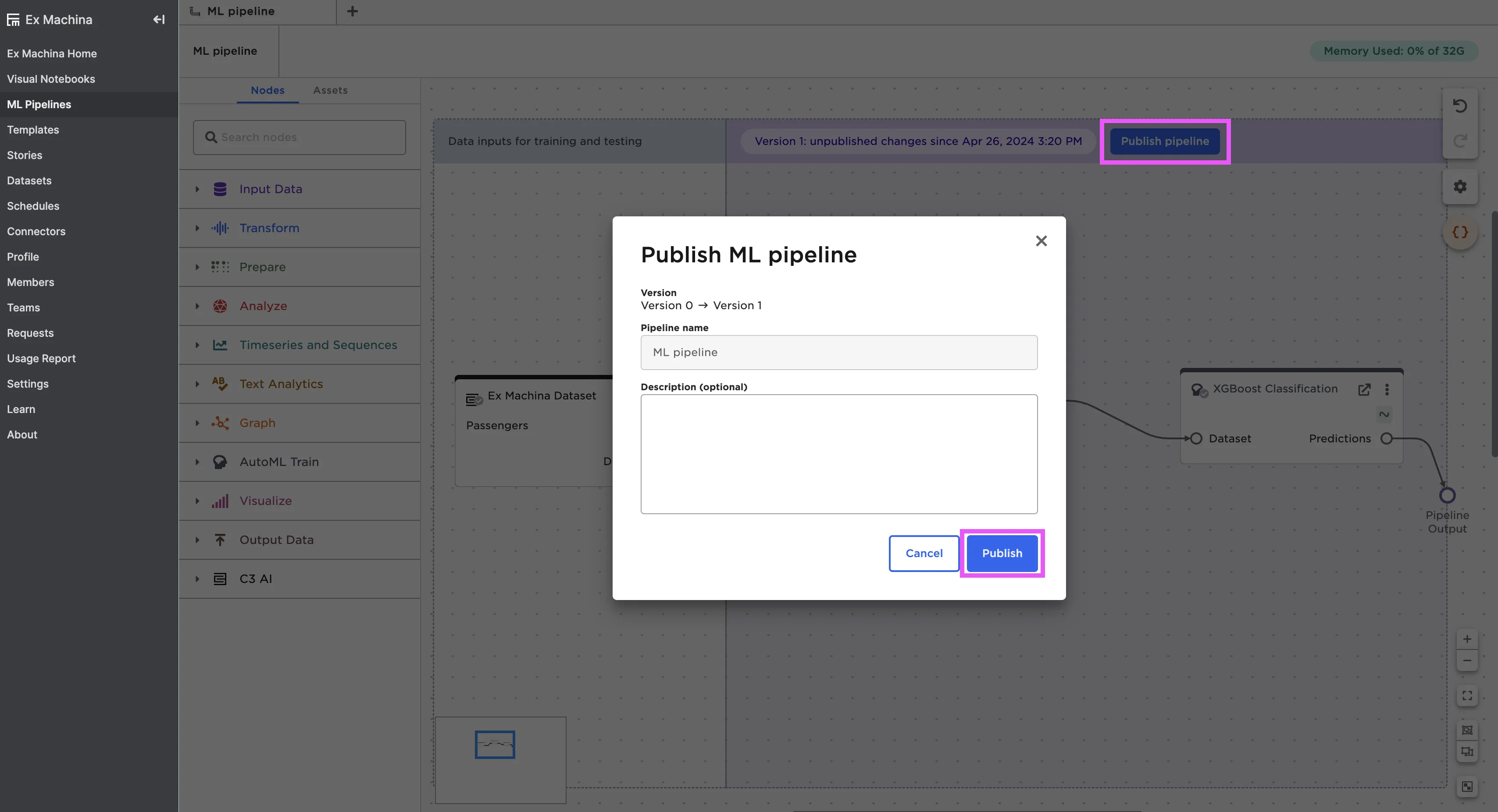 Note: If you have any AutoML nodes in your pipeline, make sure that you explicitly select the model you want to save before publishing the pipeline. To learn more about selecting a model, read the chapter on AutoML.