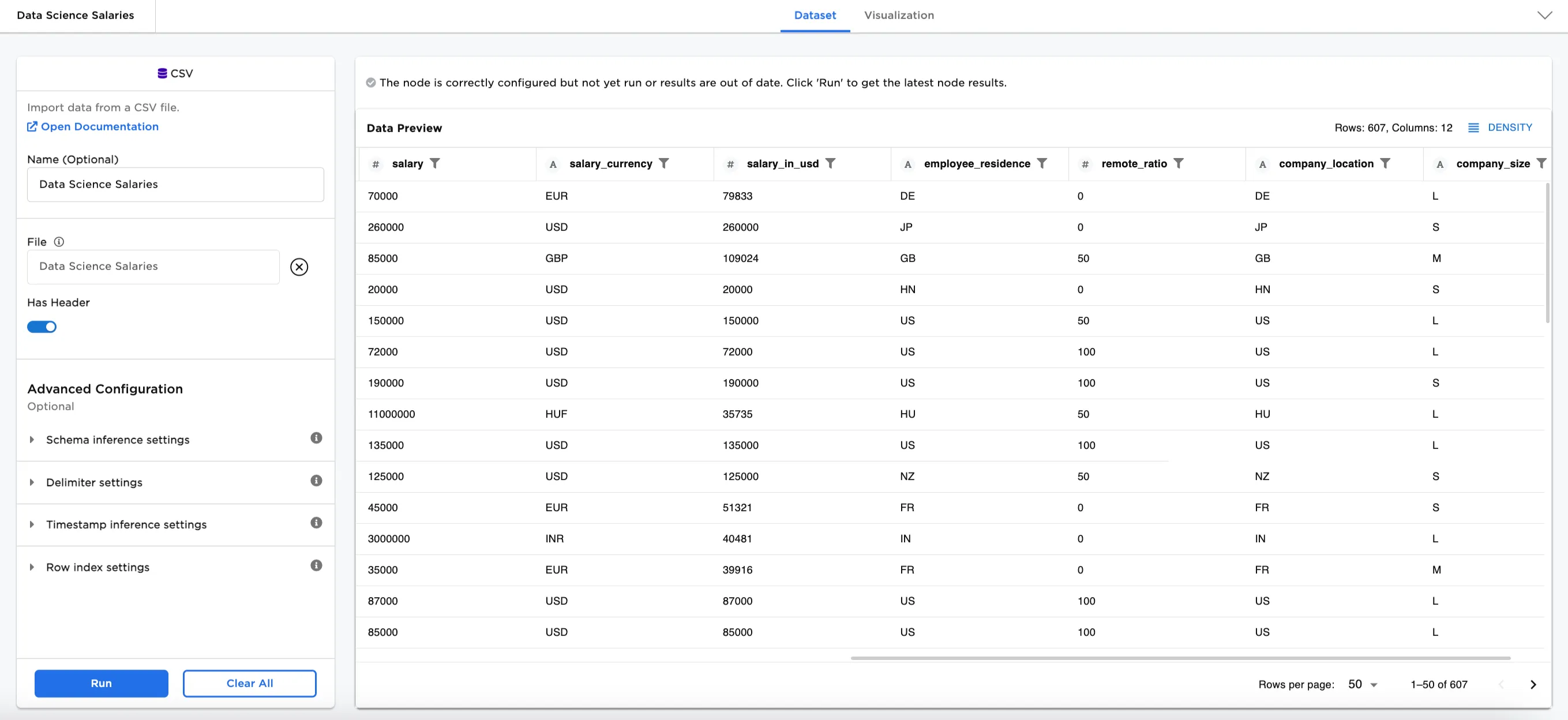 In this example, we have a dataset of data scientist salaries with 607 rows of data. The dataset includes employee residence country codes, salary currency, company location, and salary in USD. Three of those columns in the dataset were encoded to preprocess it for other machine learning nodes (salary_currency (String), employee_residence (String), and company location (String)). Now we have a need to unencode those encoded columns.