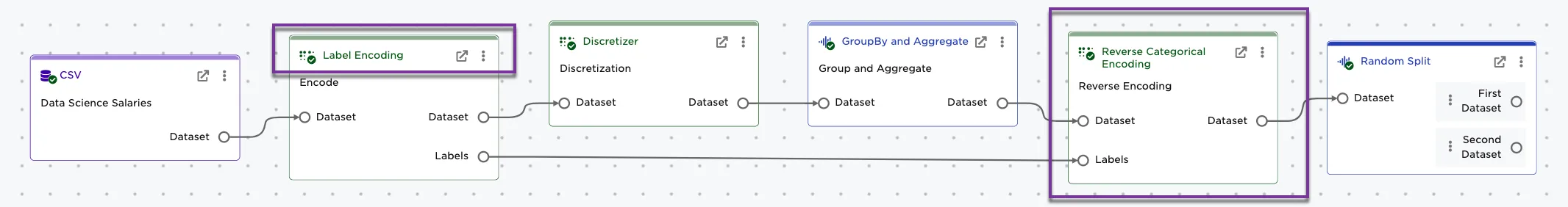 - Connect a Reverse Categorical Encoding node to an existing node. In this case, the dataset port is connected to the GroupBy and Aggregate node and the labels port is connected to the Label Encoding node.