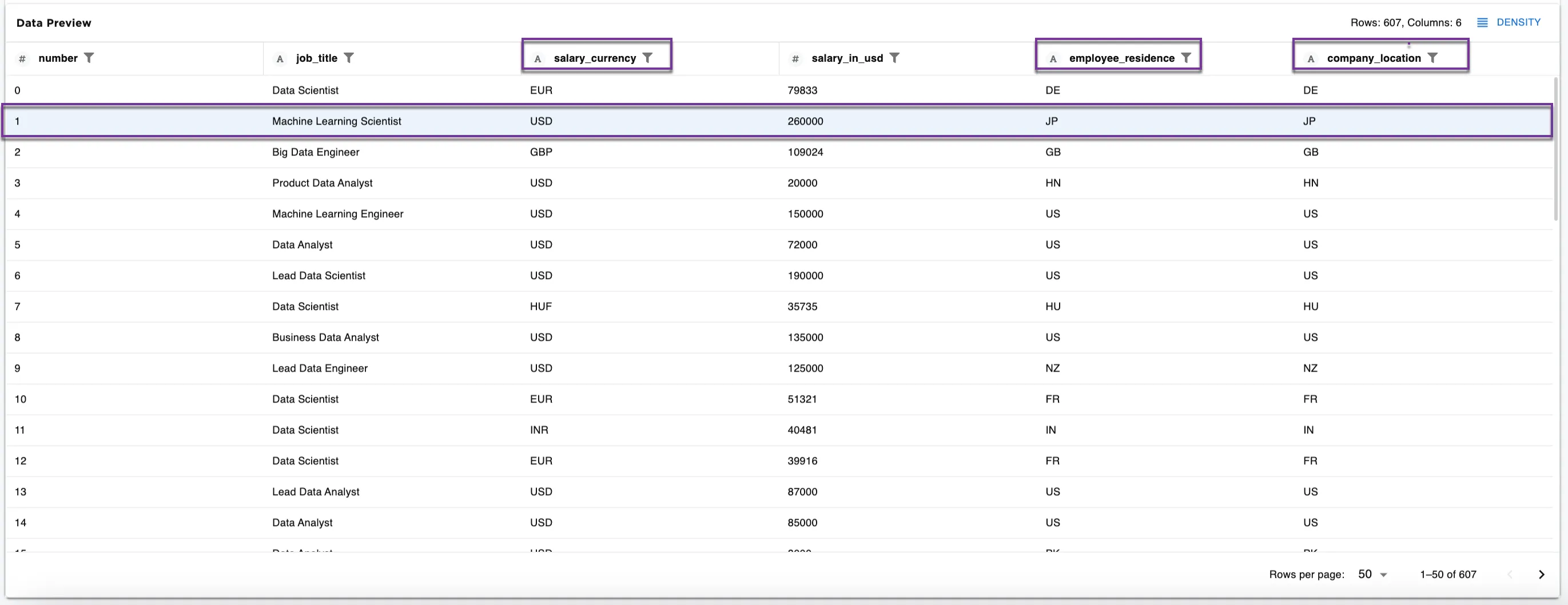 Machine Learning Scientistand260000for the salary in USD showsUSDfor the salary currency, andJPfor the employee residence and the company location once again.