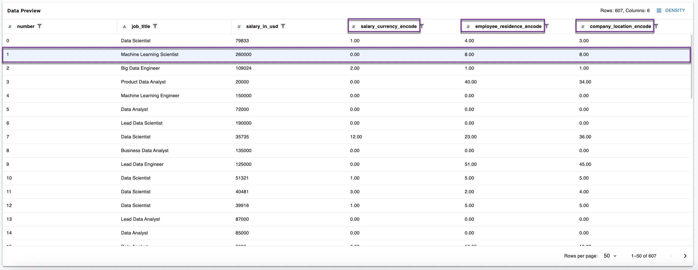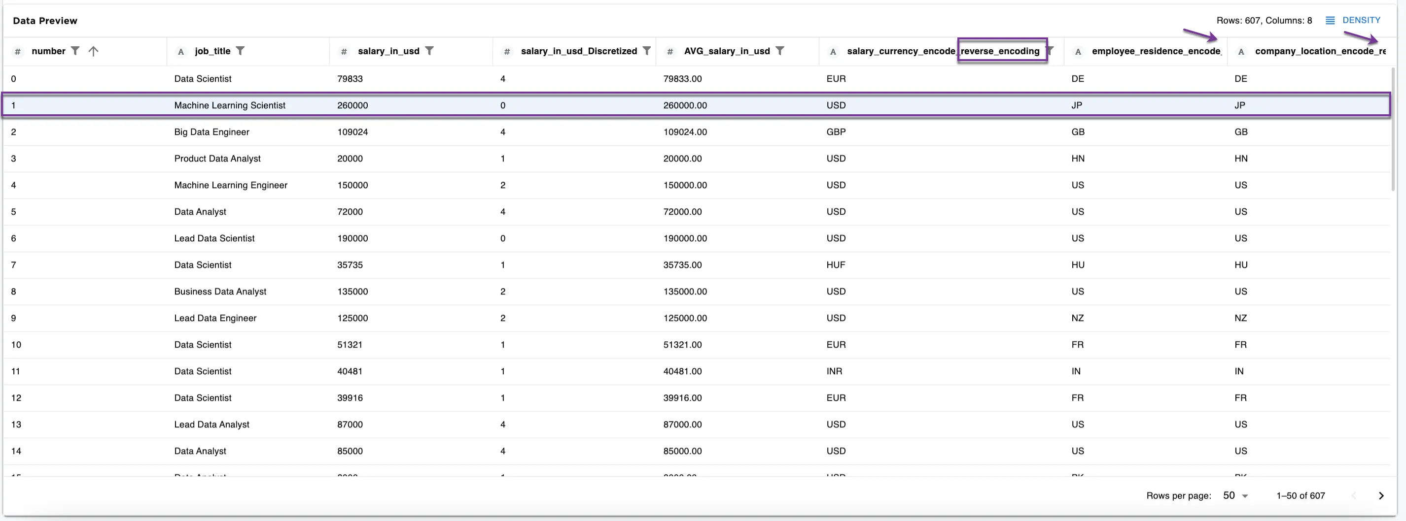 Machine Learning Scientistand260000salary in USD with0.00for the salary currency, and8.00for the employee residence and company location. - Figure 5c: The reverse encoding dataset shows