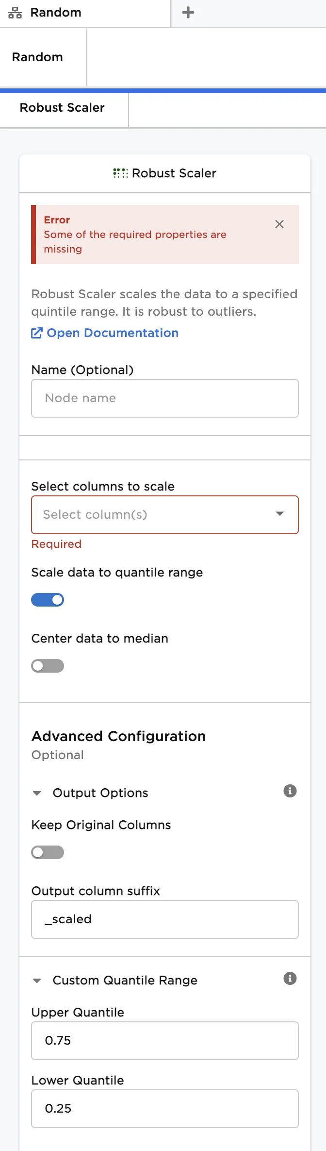 | Select columns to scale | Columns to transform with the scaling operation Select one or more numerical columns to scale. Values in each column are scaled by the quantile range of the column. |