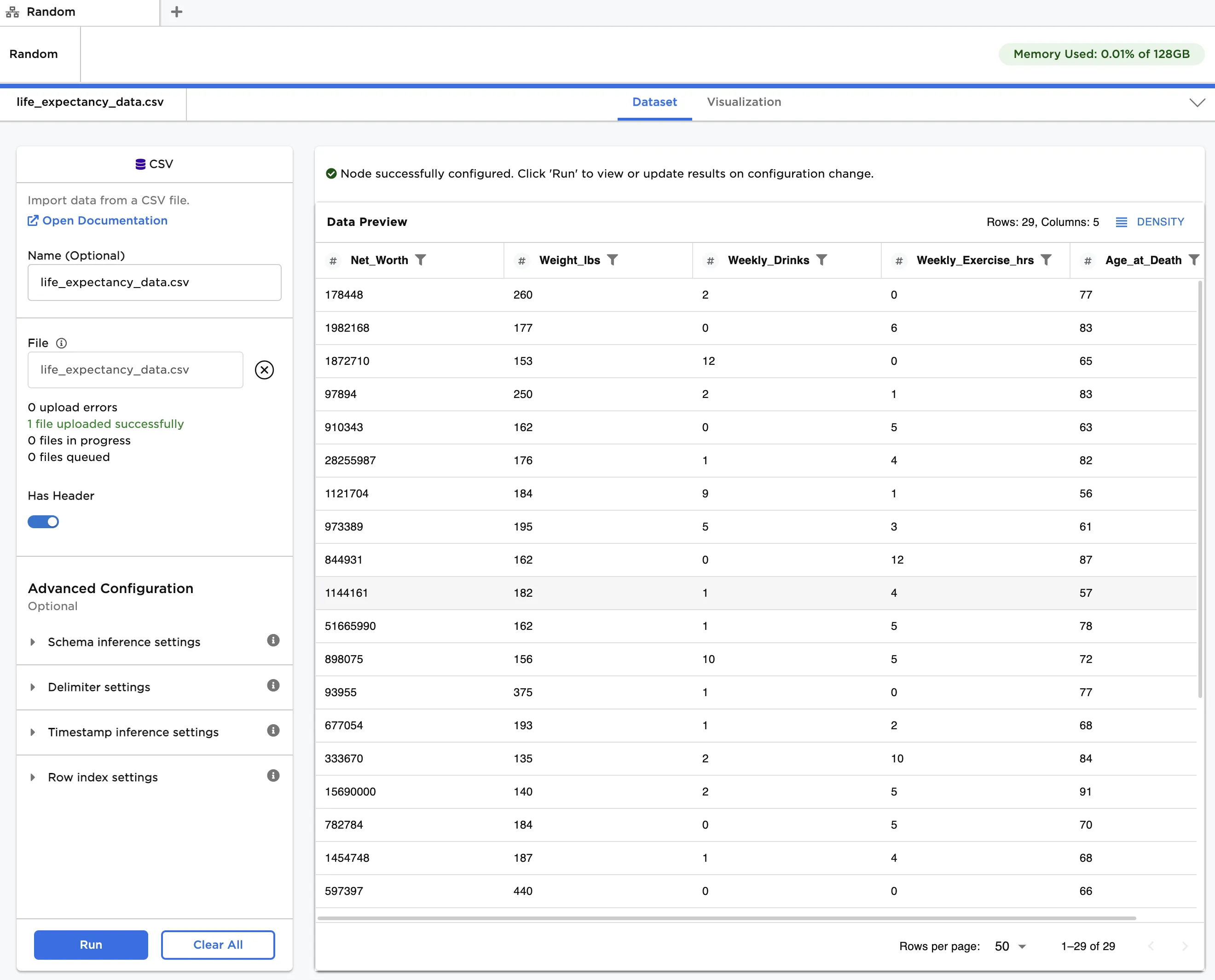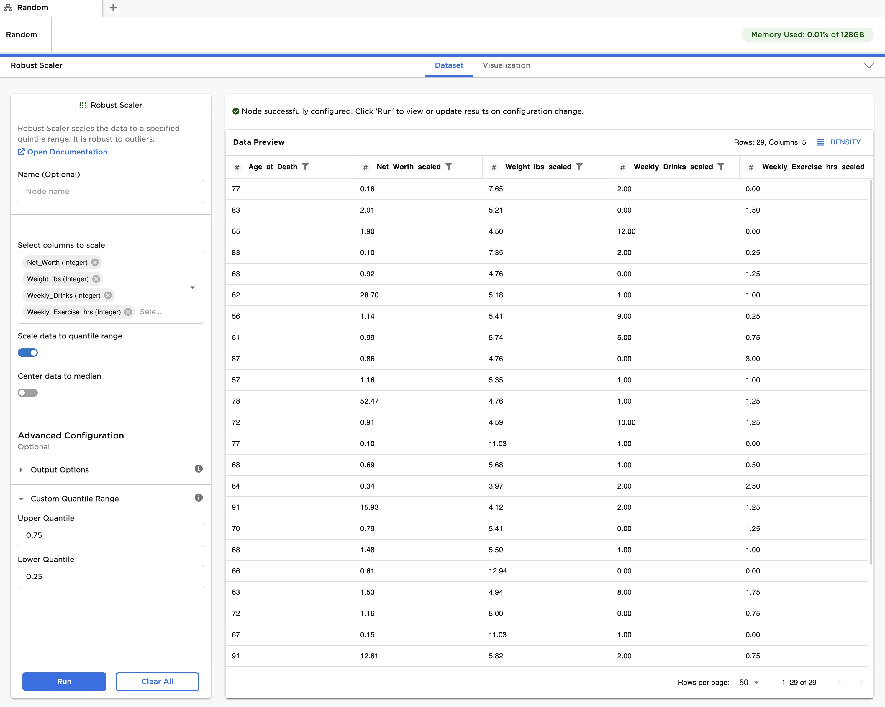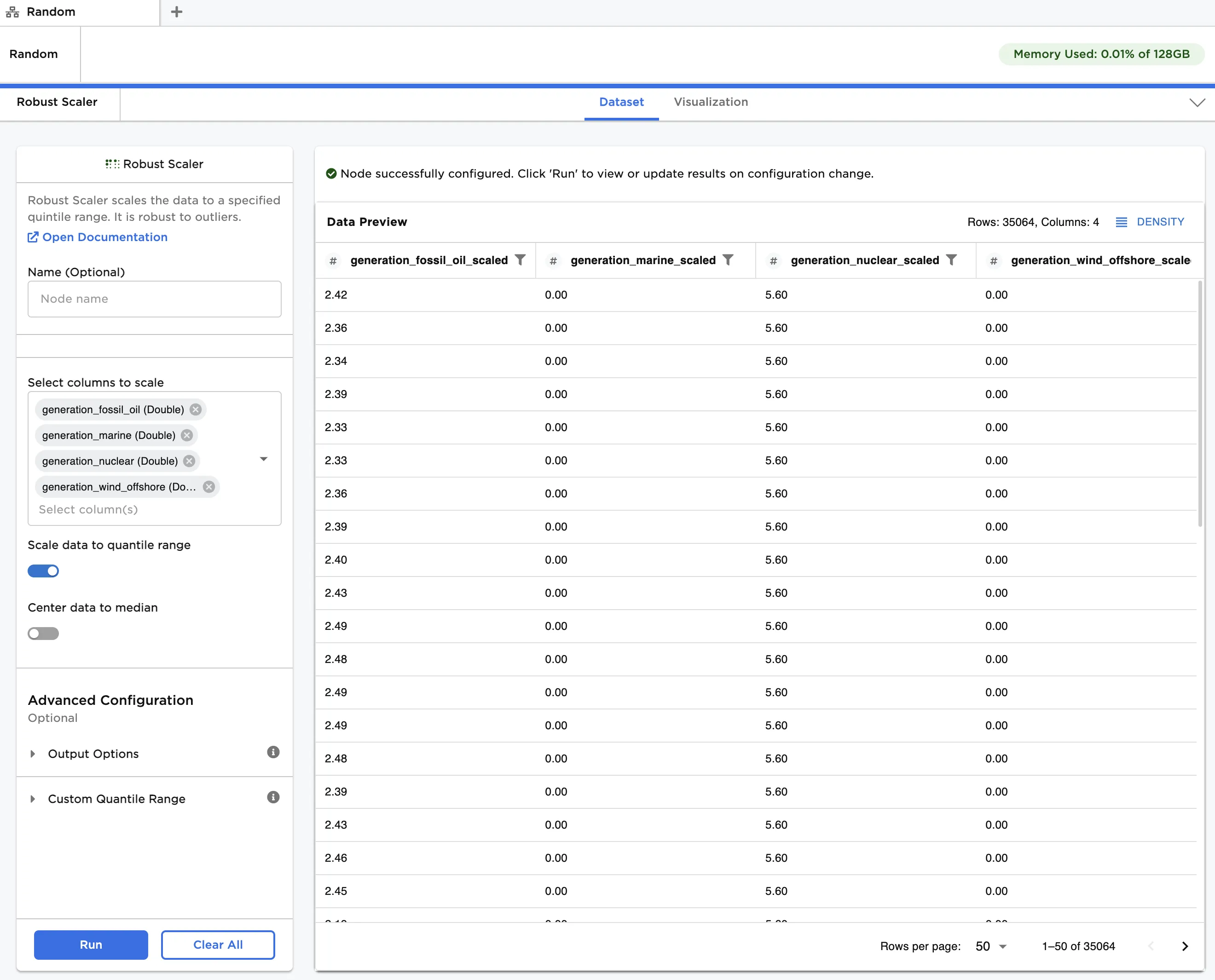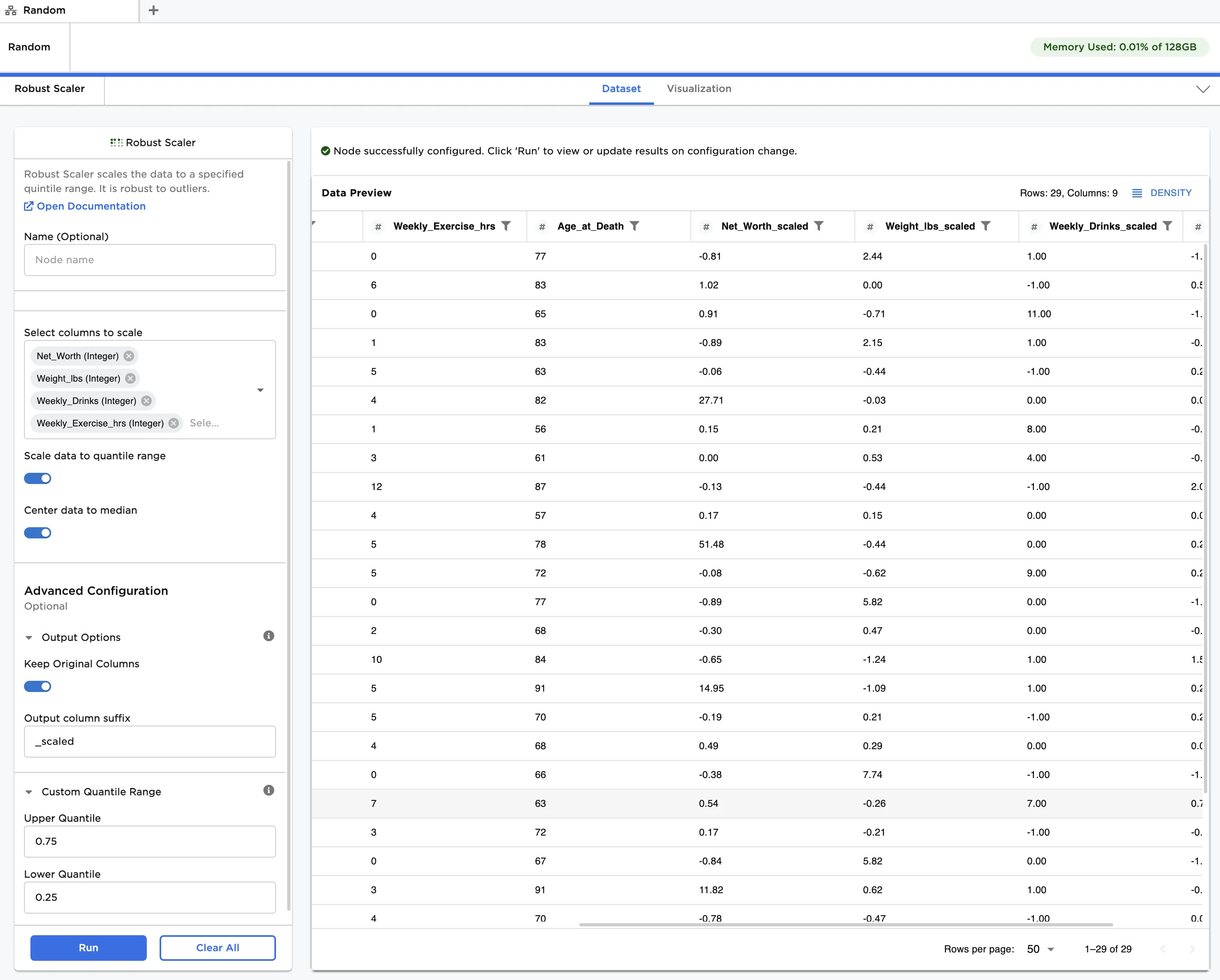 - Click Run to create a dataframe with the default settings. Observe that the original data is replaced with the scaled data. Each entry has been modified according to the following formula: