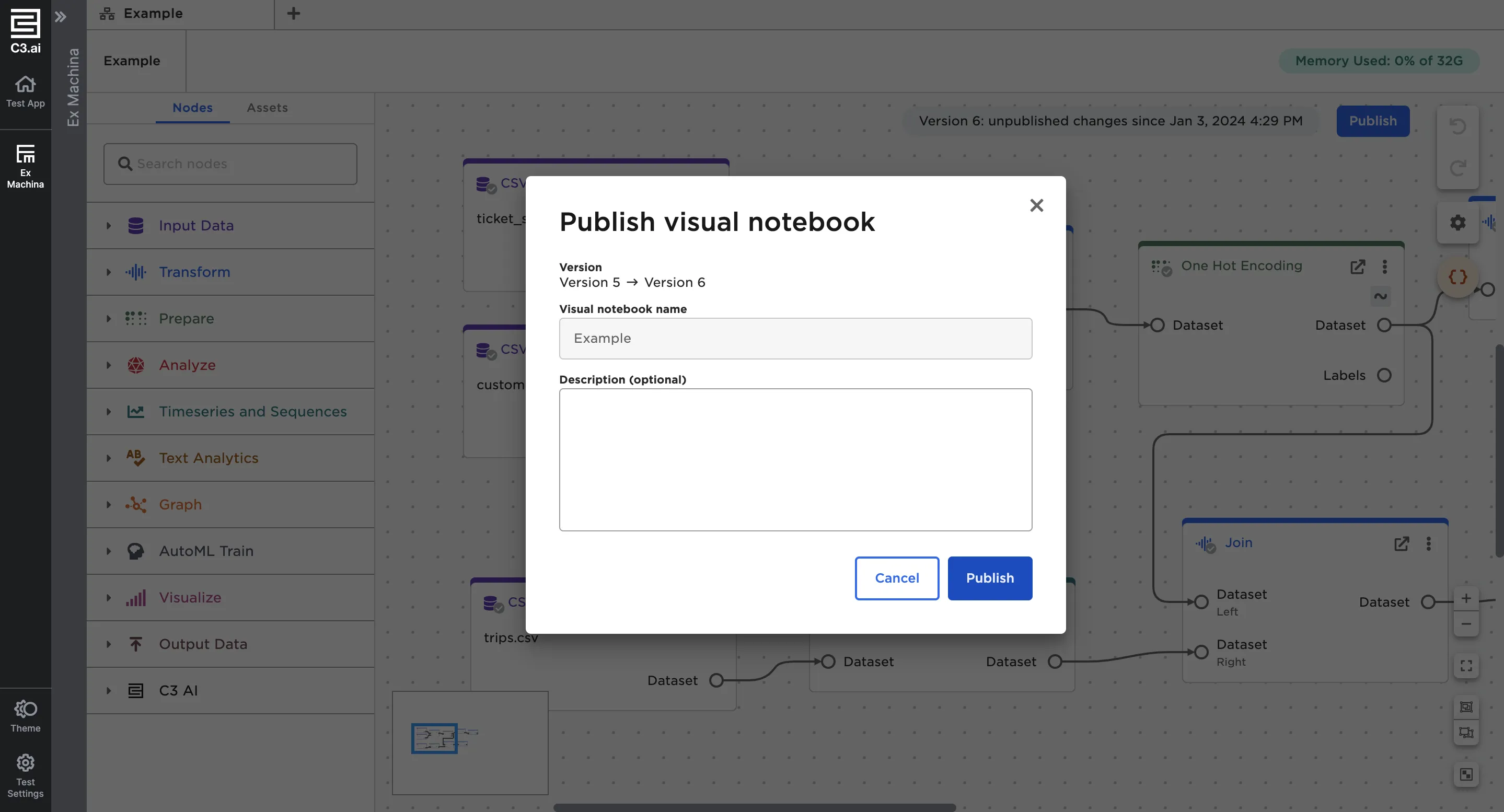 Schedules can only execute published visual notebooks. To publish a visual notebook, select the blue Publish button in the top right corner of the editor when the notebook is open. When the modal appears, select Publish.