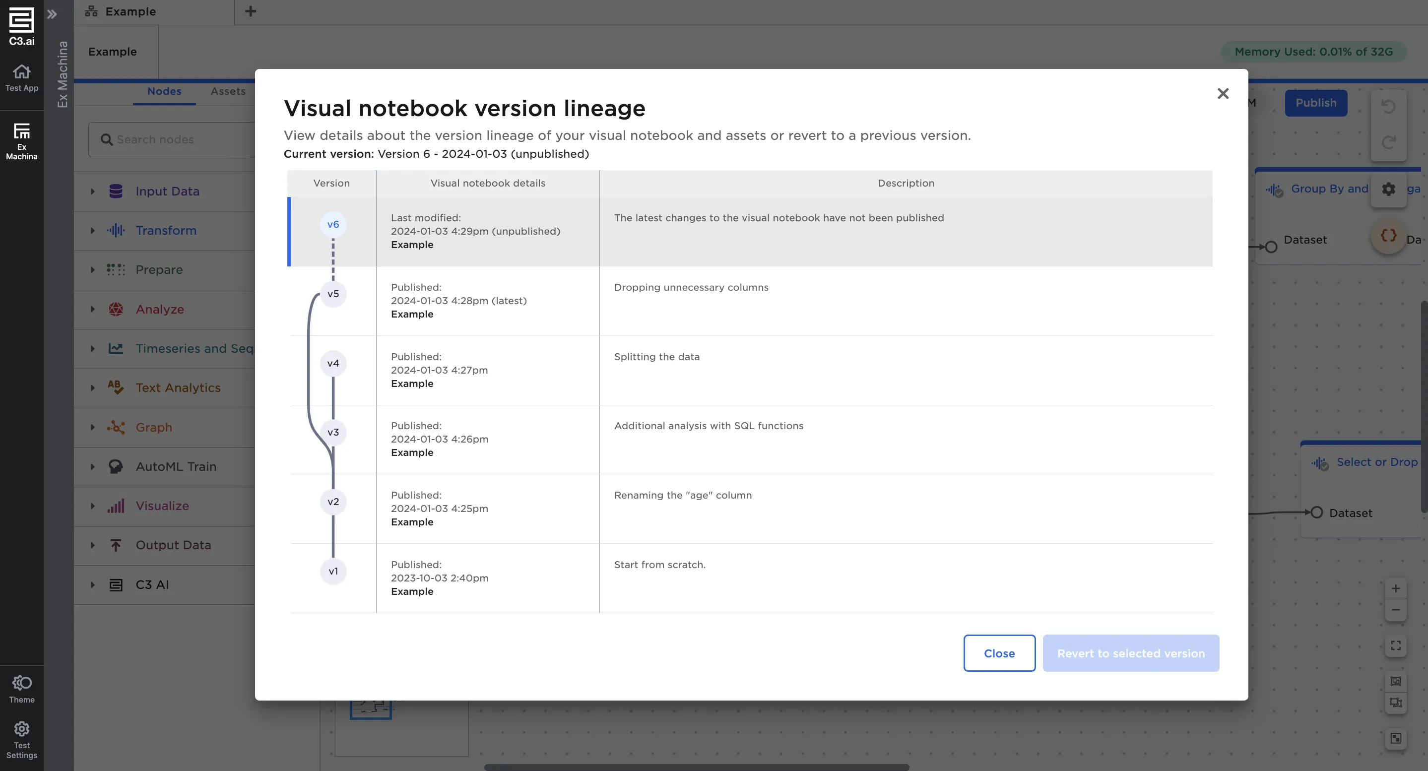 Once published, you can select the version number beside the Publish button to view the notebook lineage.