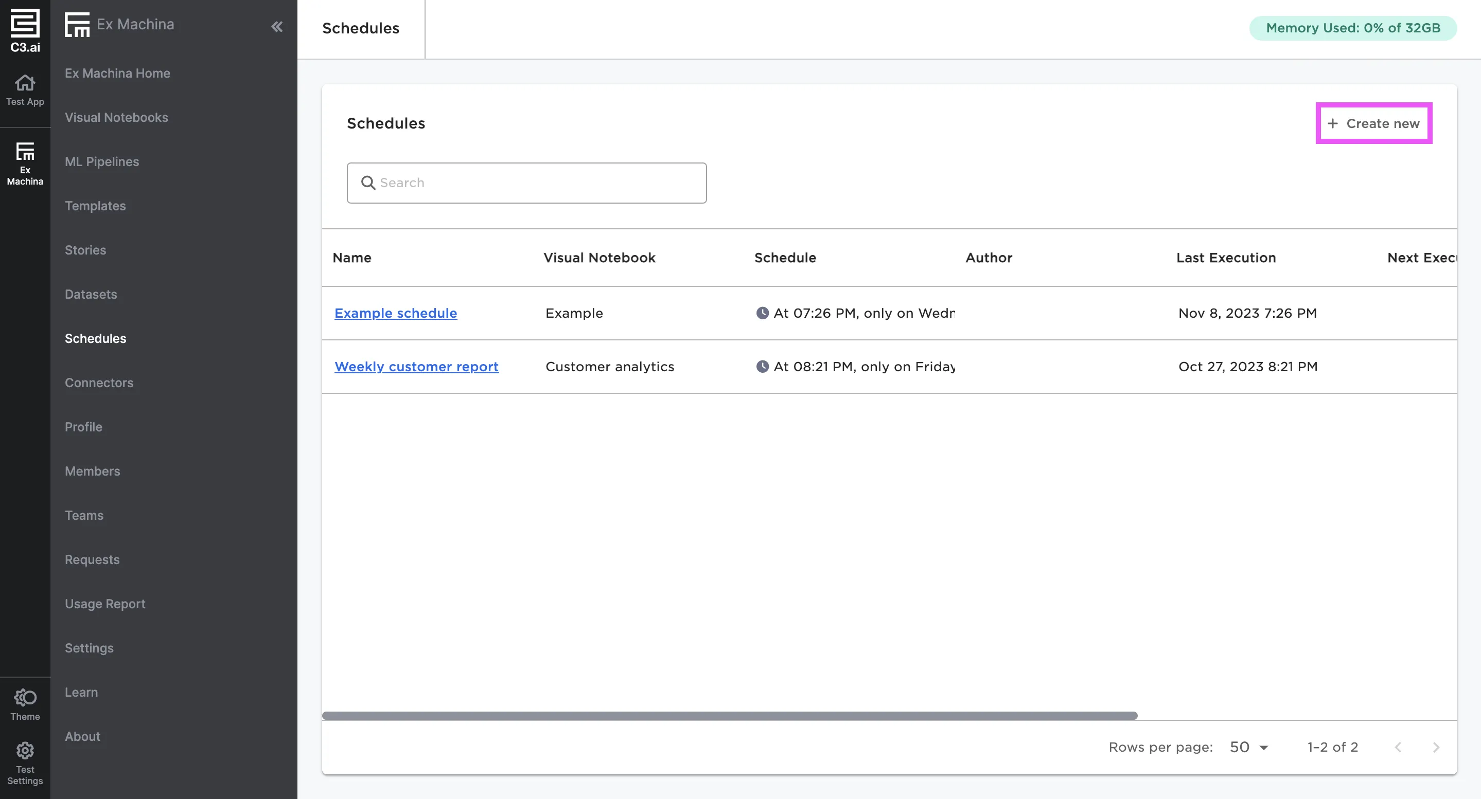 Navigate to the Schedules page using the left sidebar. Select + Create new to create a new schedule.