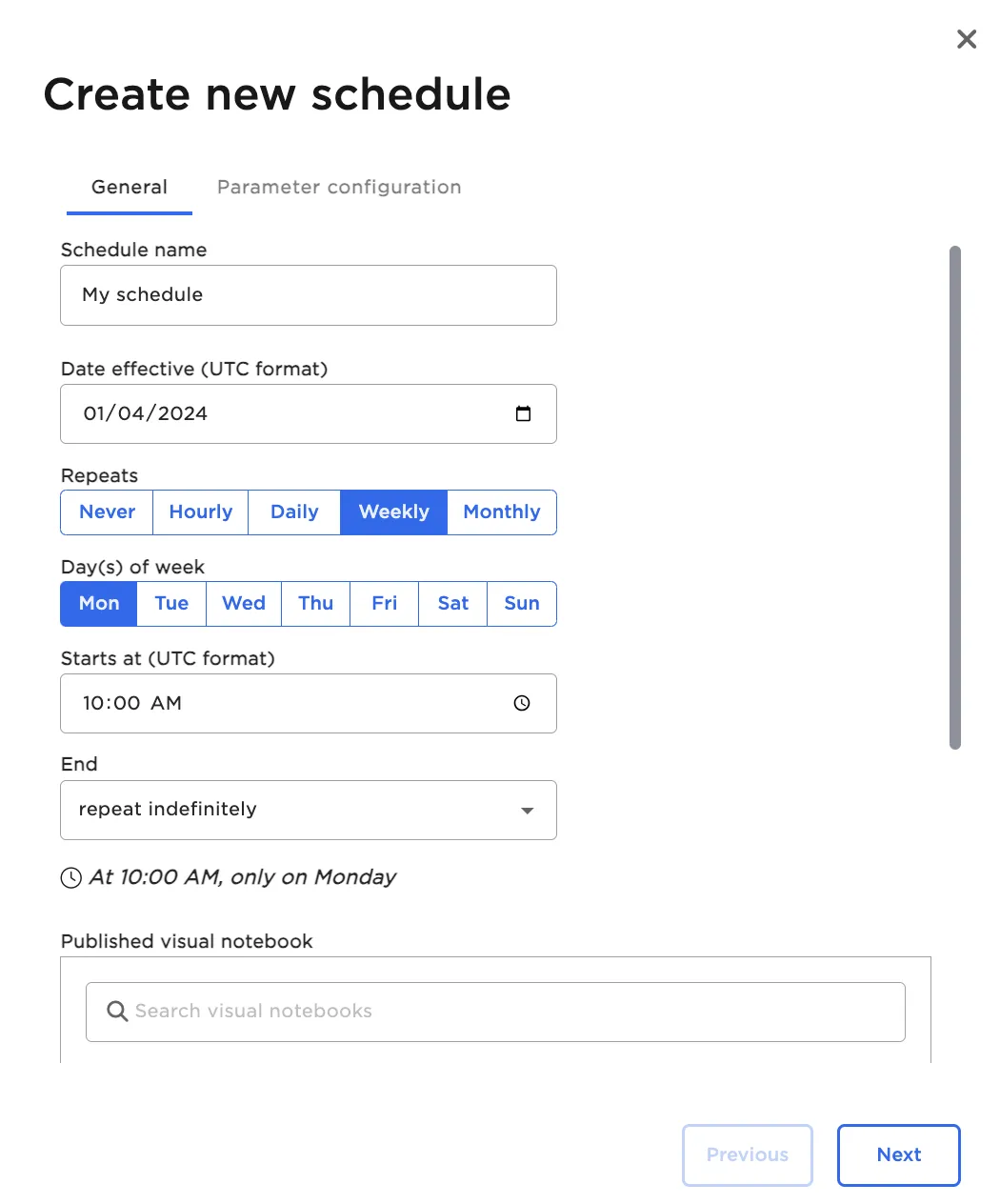 This opens a modal with fields to create a schedule. Schedules can be run once or repeat hourly, daily, weekly, or monthly. If configured to run repeatedly, you can define an end date if desired. Once the desired frequency is specified, select a version of a published visual notebook to run using the schedule.