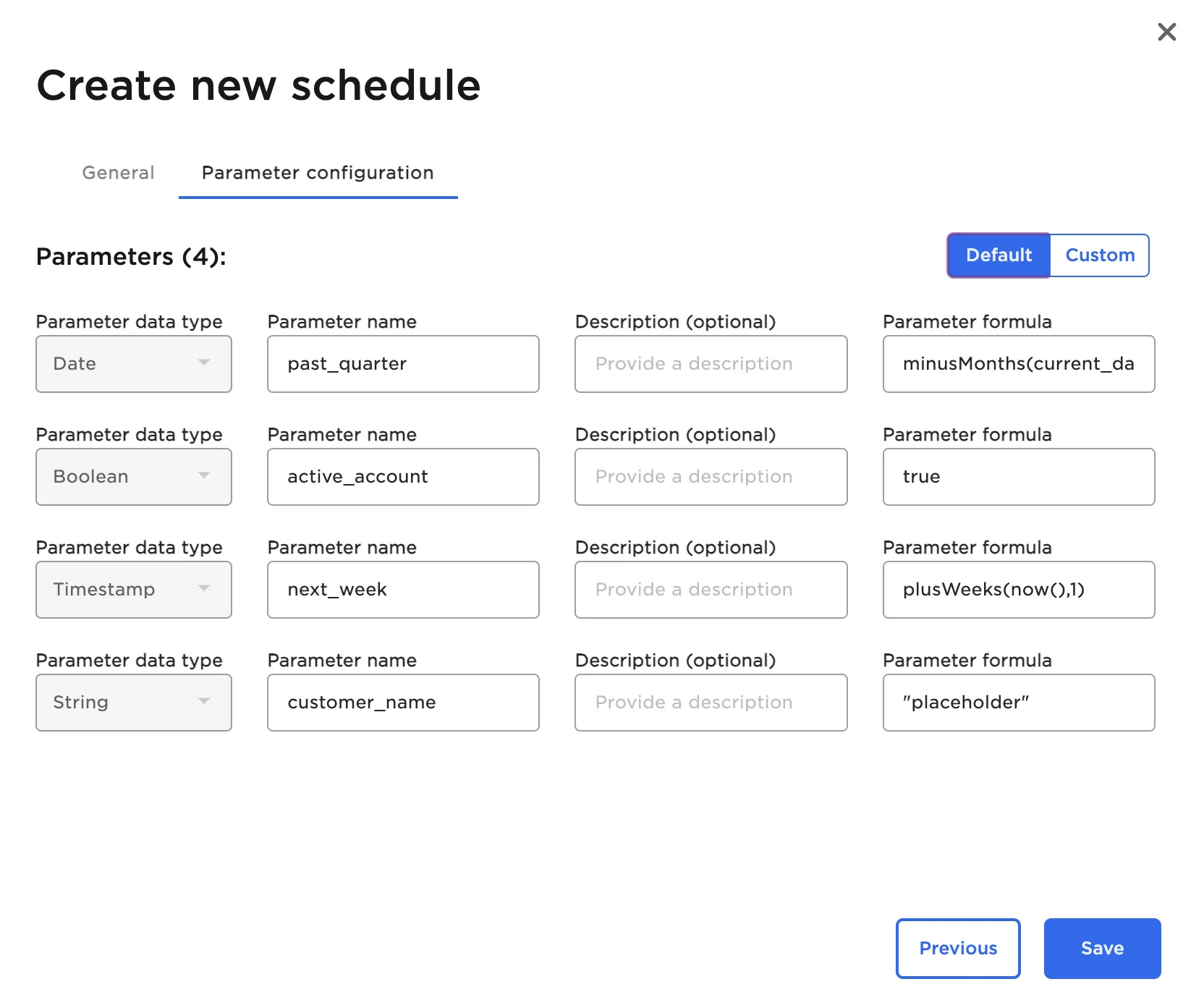 If you want to override a parameter when running the schedule, select Custom and select the Parameter formula field for the specific parameter to change. Modify the formula as desired, then select Save.