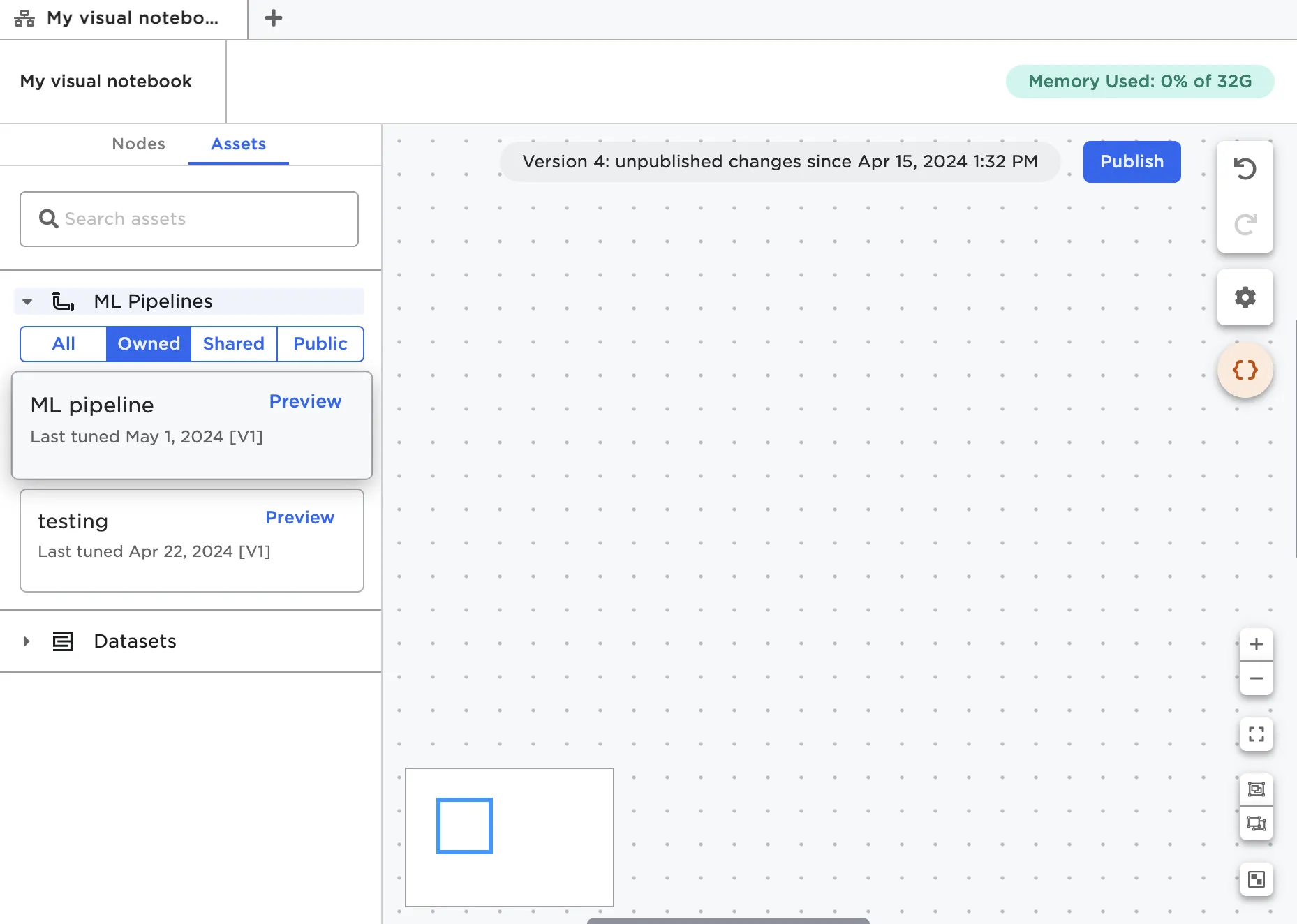 Once published, pipelines act similar to nodes in Visual Notebooks. From a visual notebook, switch to the Assets tab and expand the section for ML pipelines.