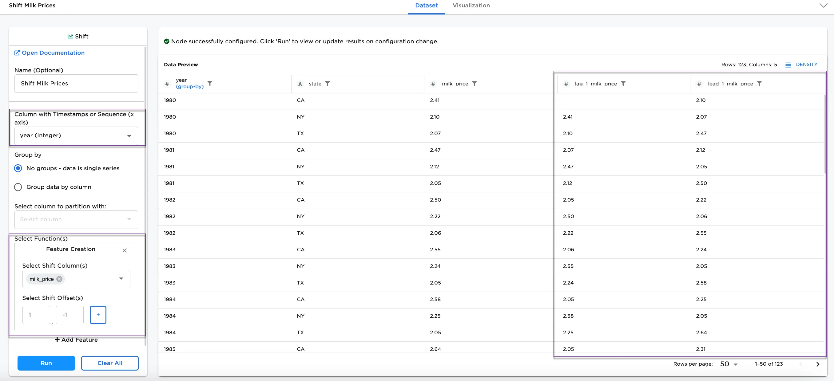 milk_priceis selected for the Select Shift Column(s), and1and-1are selected for the Select Shift Offset(s) field.