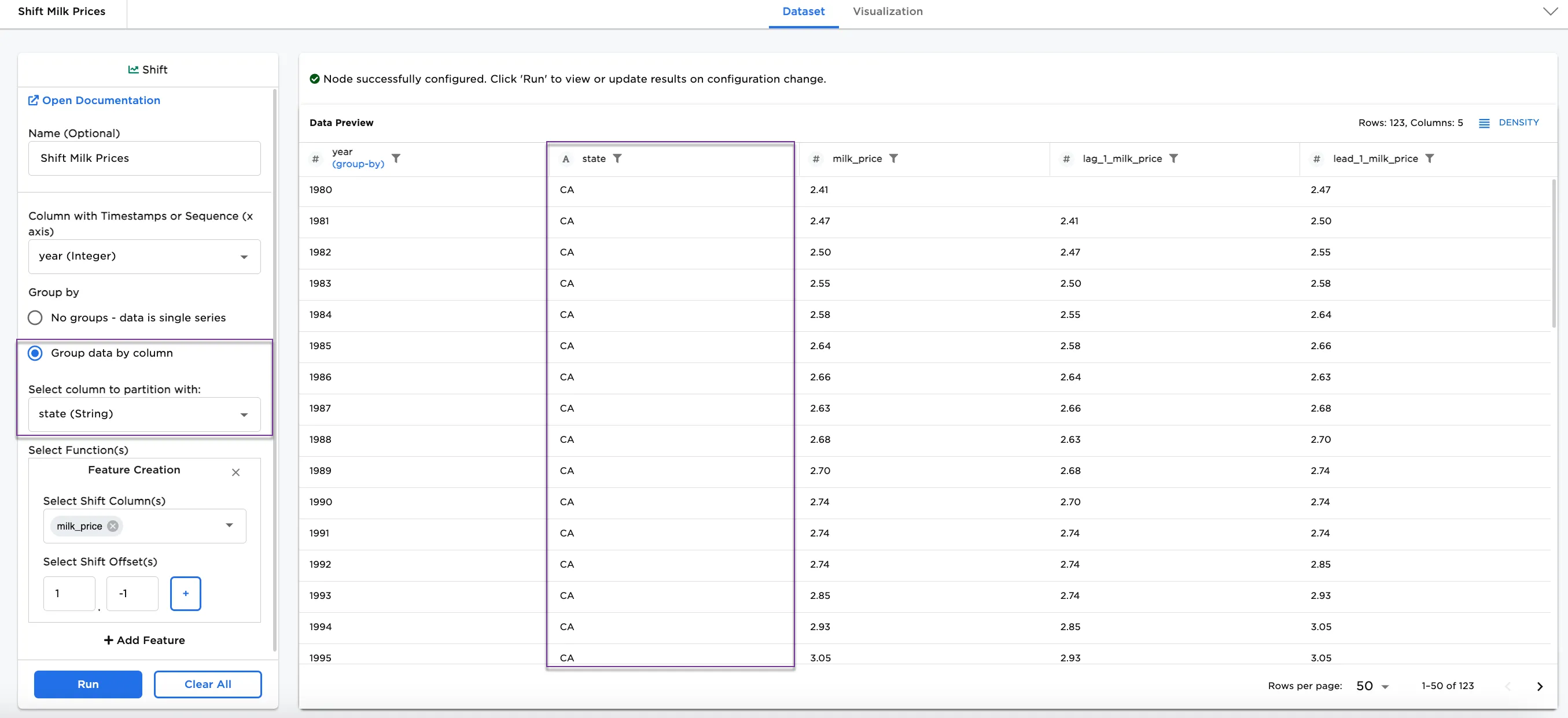 milk_priceand1and-1for the offset creates two new columns called,lag_1_milk_priceandlead_1_milk_price.Multiple columns and multiple functions can be selected at once to create multiple new columns. For convenience and readability, separate feature selections can also be created. - Shift Offset(s) field: As noted in the Configuration table, the shift offset(s) can be positive integer to calculate the shift with the value before the selection (lag) and a negative integer to calculate the shift with the value after the selection (lead). In the examples, there are three entries of milk prices, one each for CA, NY, and TX. This means that only a 2, 1, -1, and -2 offset can be selected when grouping by date or by state. There is not enough data to support an offset of 3 lag, or -3 lead. Larger lags and leads can only be used without grouping the data.
