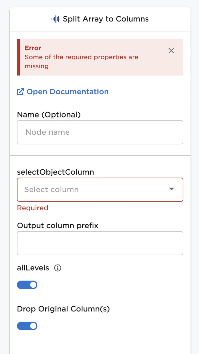| Drop Original Column(s) | Toggle to drop/keep original columns Leave the switch on to delete the original Array column from which output columns are extracted. Toggle the switch off to keep the selected column. |