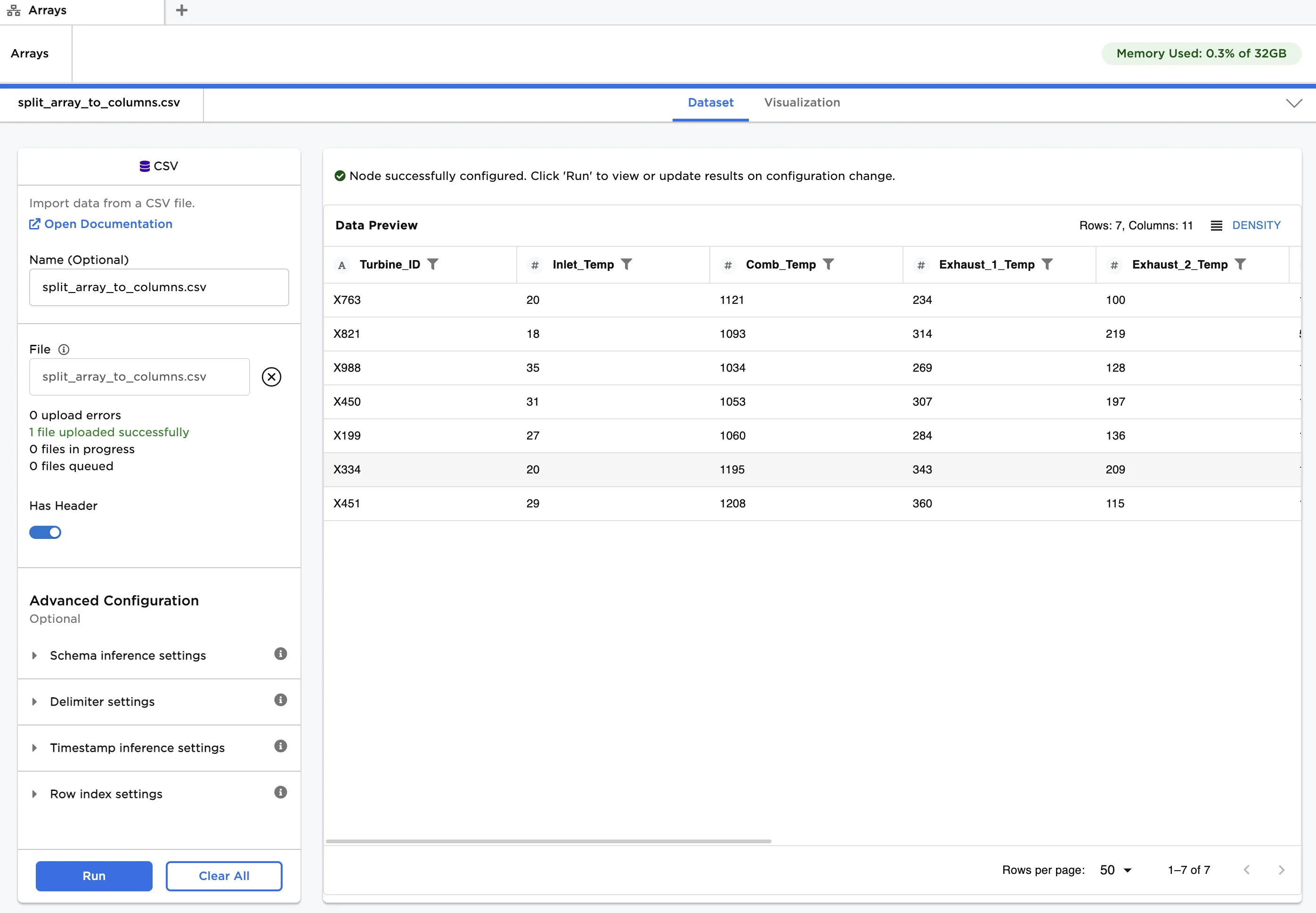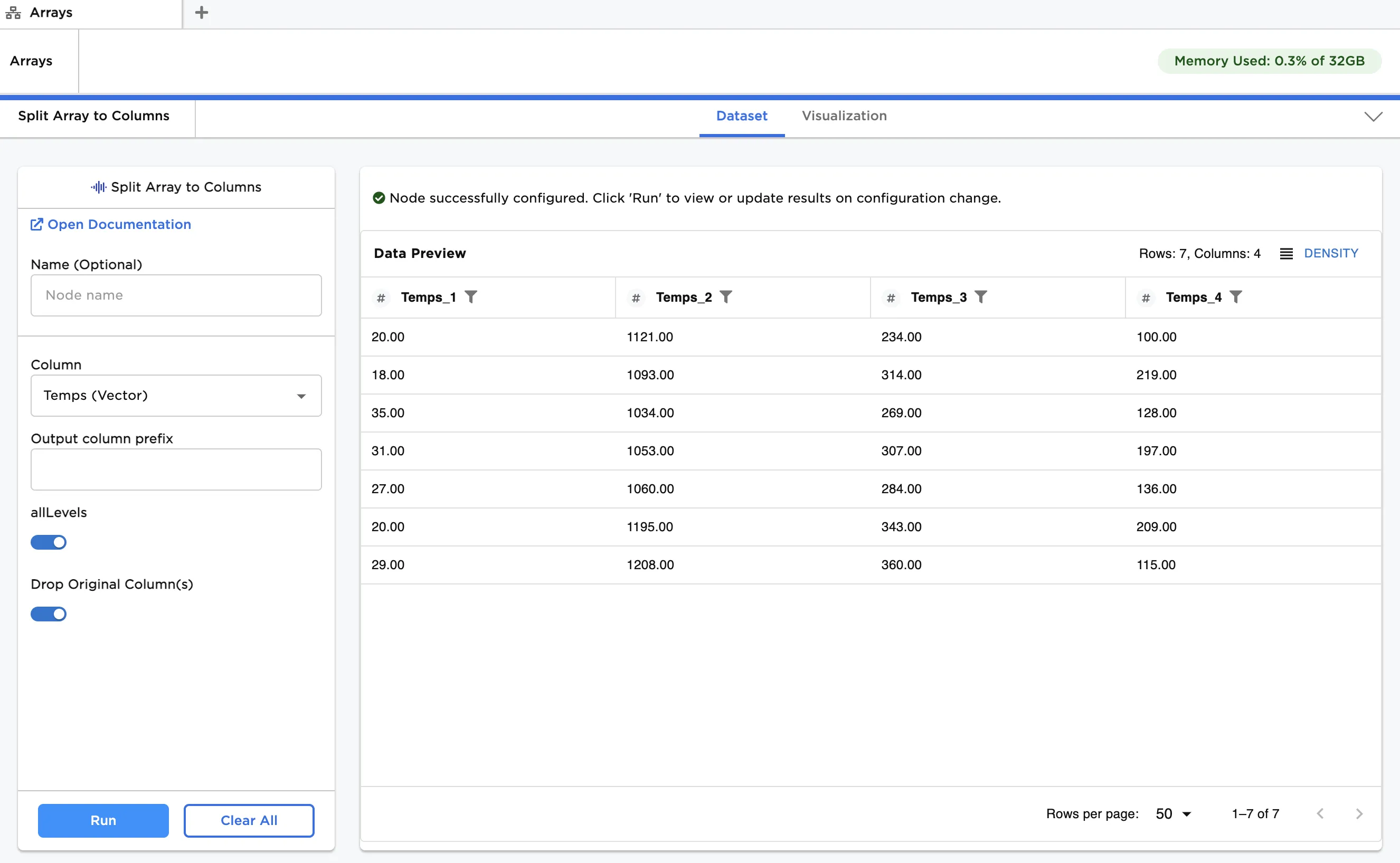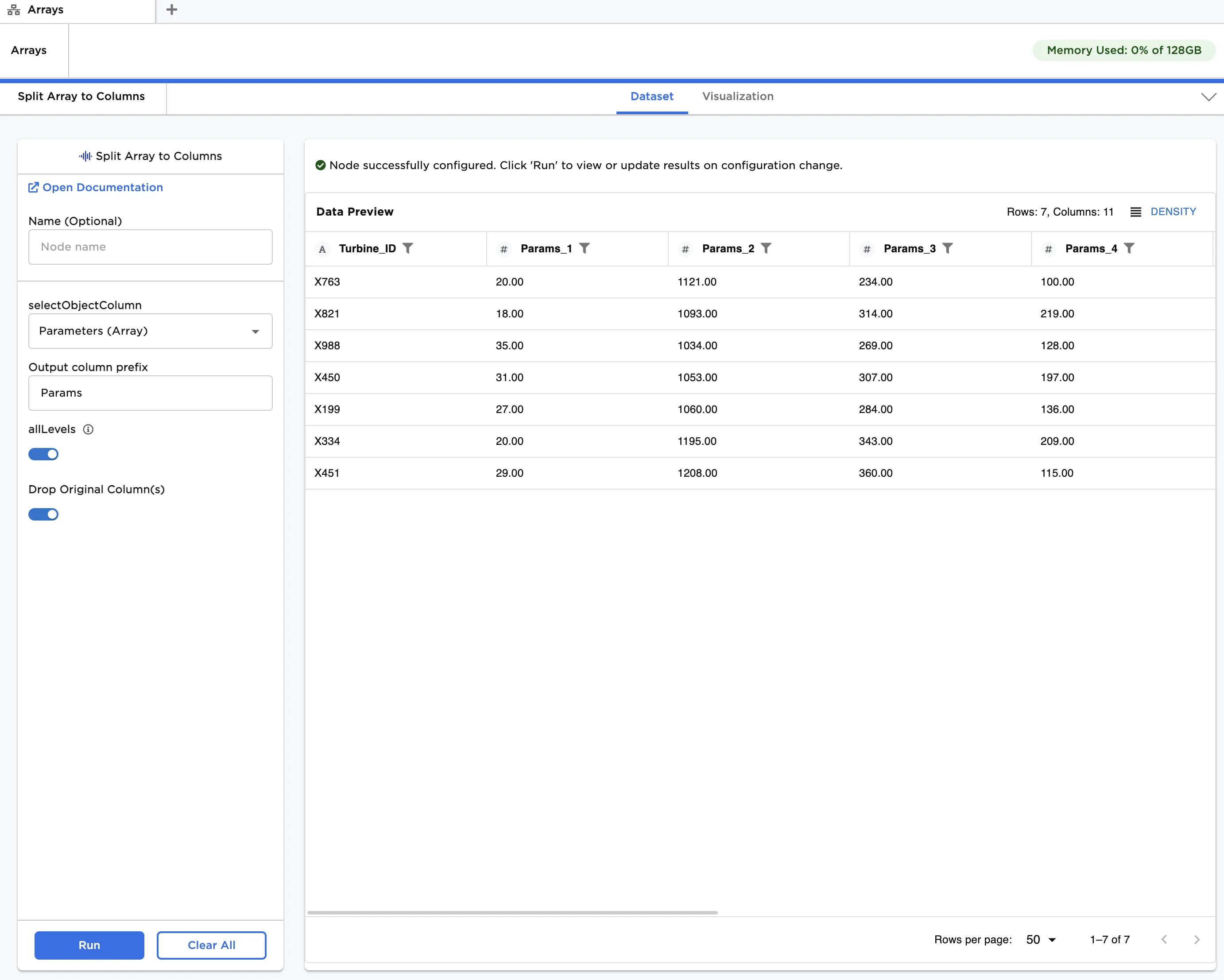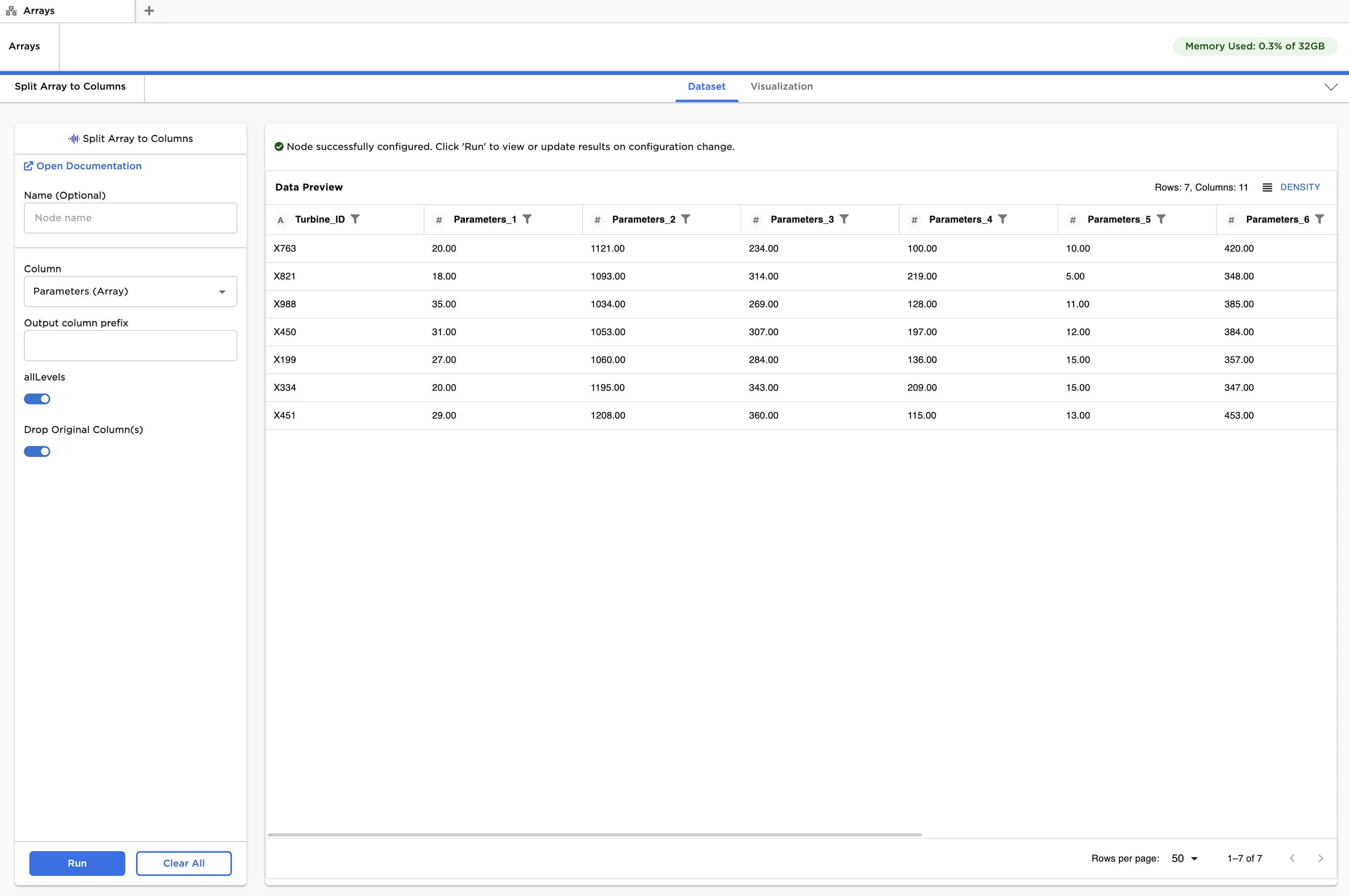 This setting recursively splits all levels of the initial Array structure until all resulting columns are primitives. In this example, ten new columns are generated from the original "Parameters" column as shown in Figure 6.