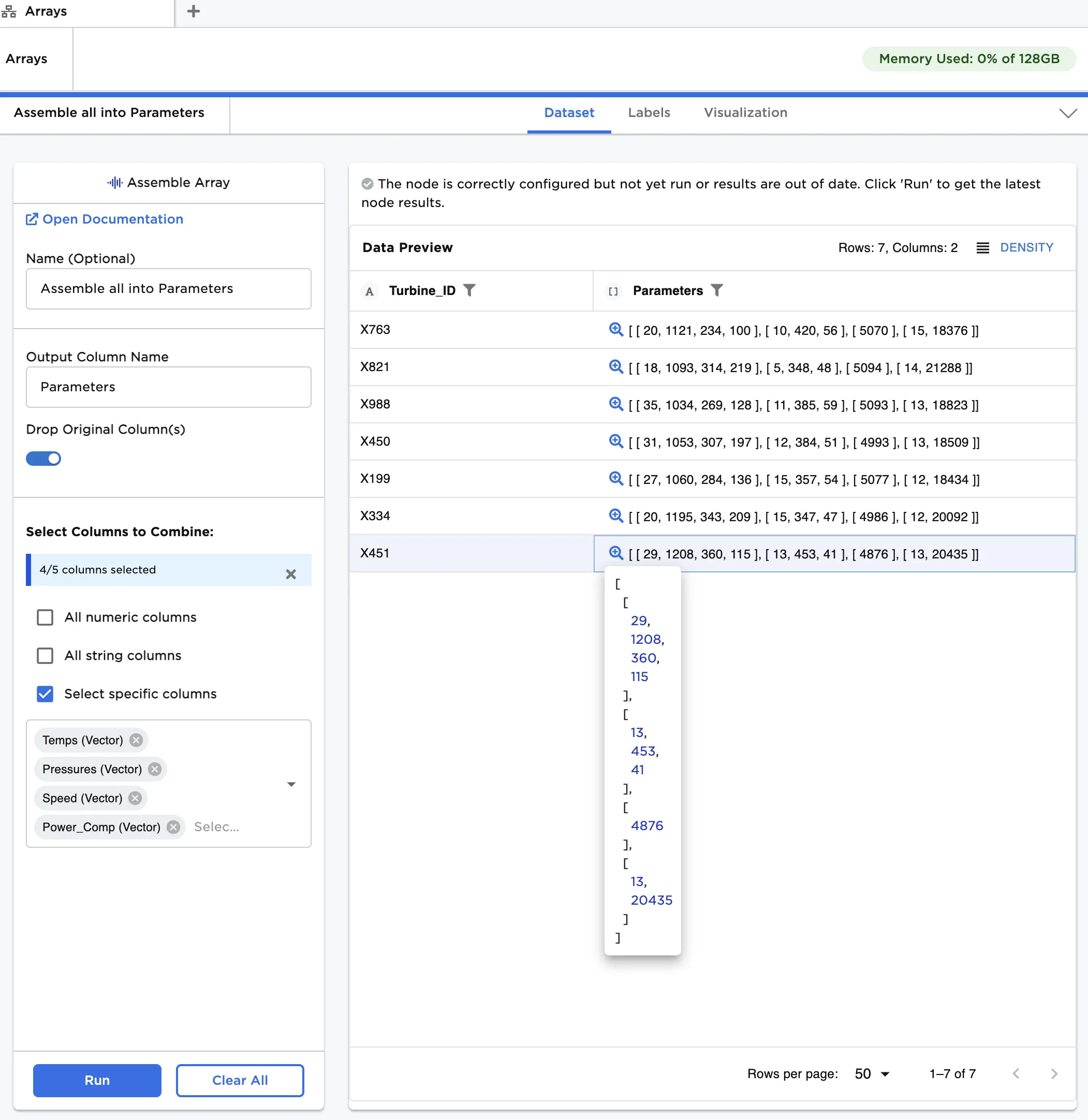 Returning to the original dataset, we first create the four simple Array columns: Temps, Pressures, Speed, and Power_Comp. Column groupings are as follows: