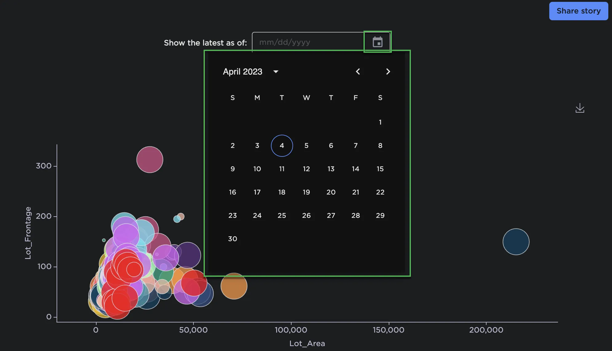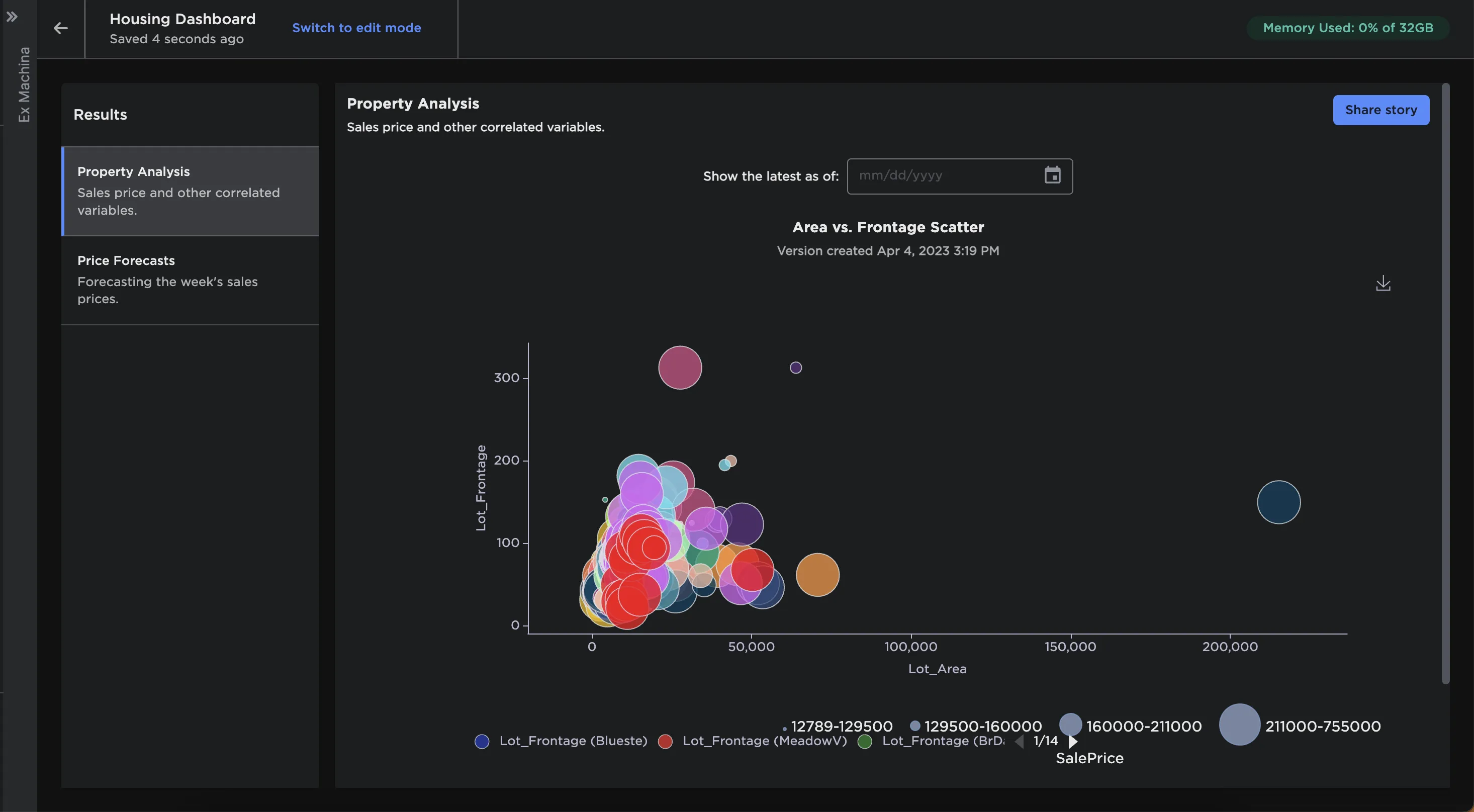 Visual Notebooks stories are native, multi-page dashboards created from visualizations defined within Visual Notebooks projects. Stories can be shared with team members and viewed at any time without starting an Visual Notebooks workspace. Stories are automatically updated each time a project with an associated visualization is run.