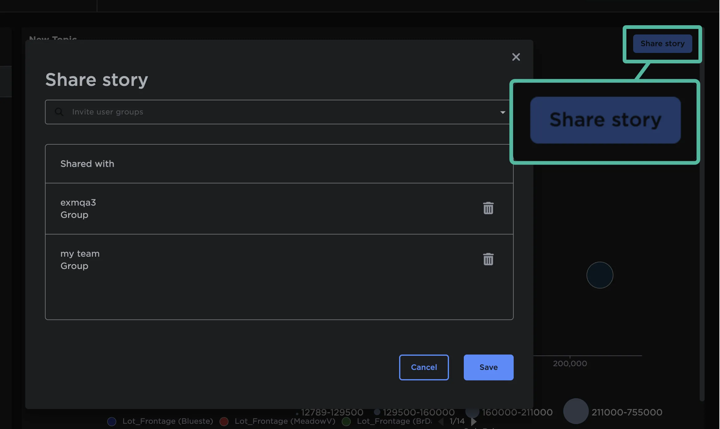 You can share a story directly by selecting the Share story button and selecting the teams with which you want to share the story.