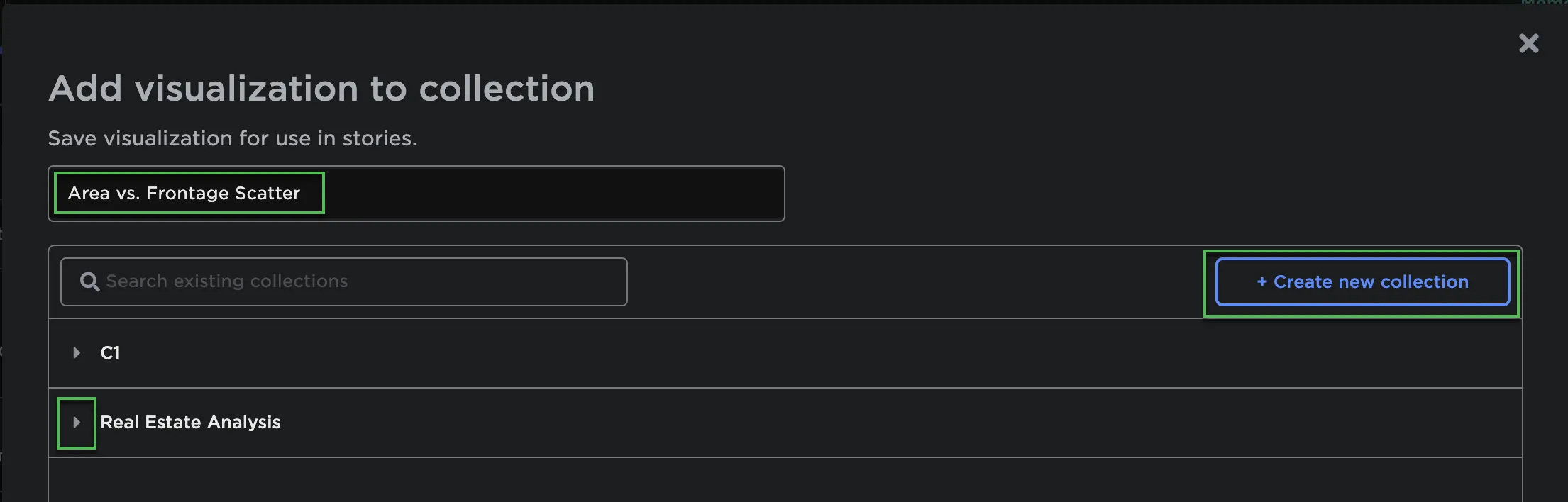 Before making a story, you must have visualizations in a collection. Collections can be thought of as folders or directories used to organize visualizations. A collection may represent a topic or use case.