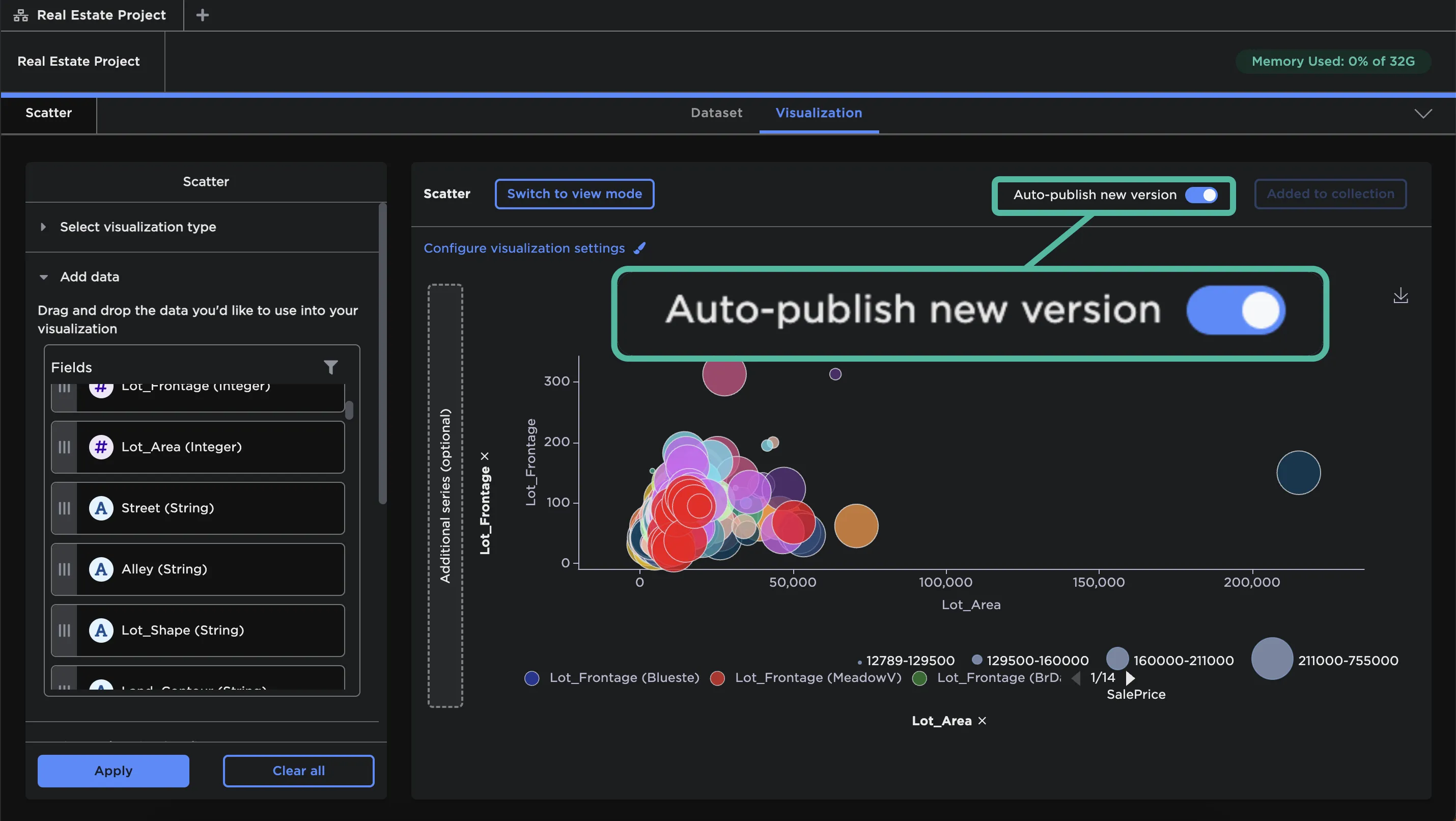 If you'd like your chart to automatically update when this visual notebook is run, make sure to toggle on Auto-publish new version.
