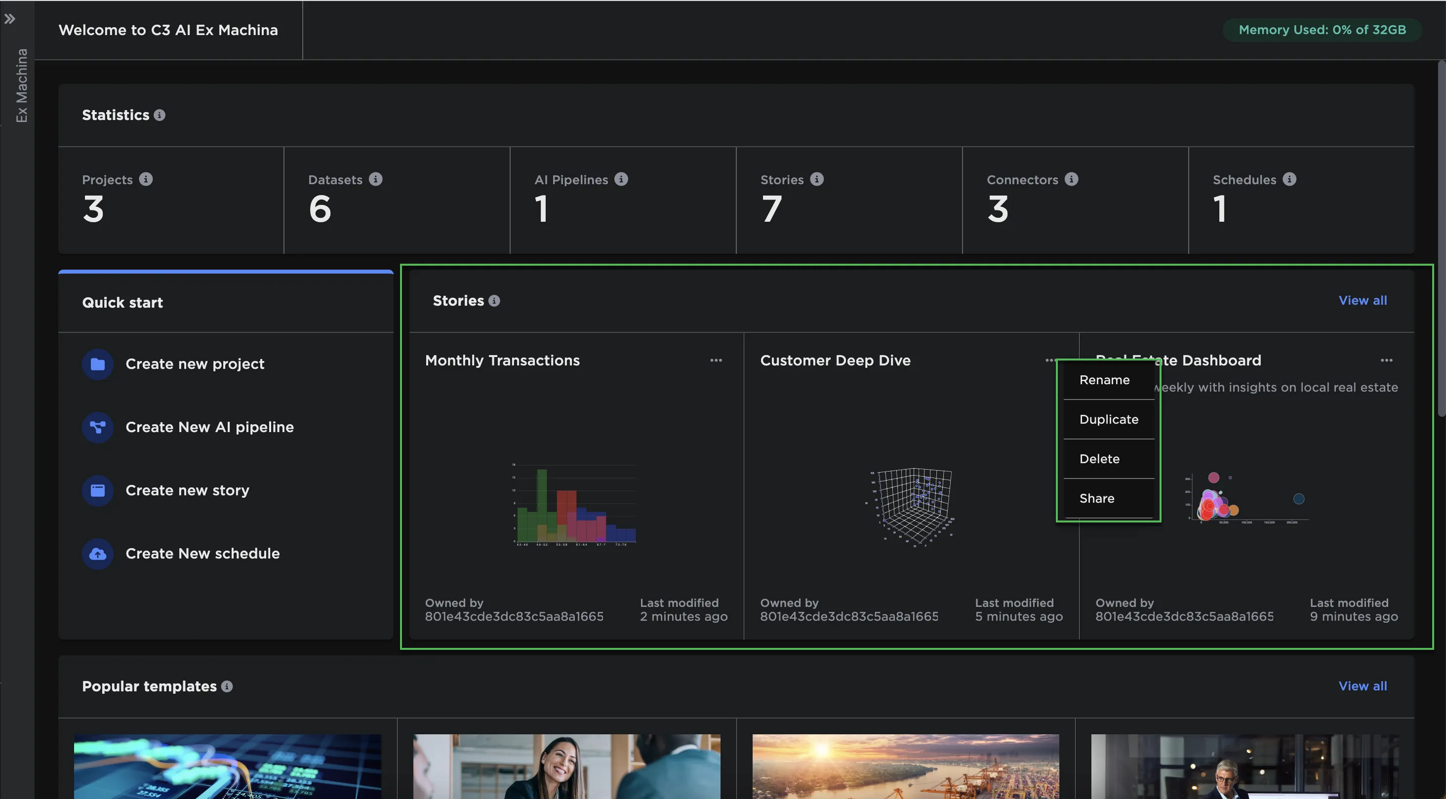 Stories you've recently created appear on the homepage. Select the title of a story to view it. Select the three dots next to a recent story to rename, duplicate, delete, or share that story.