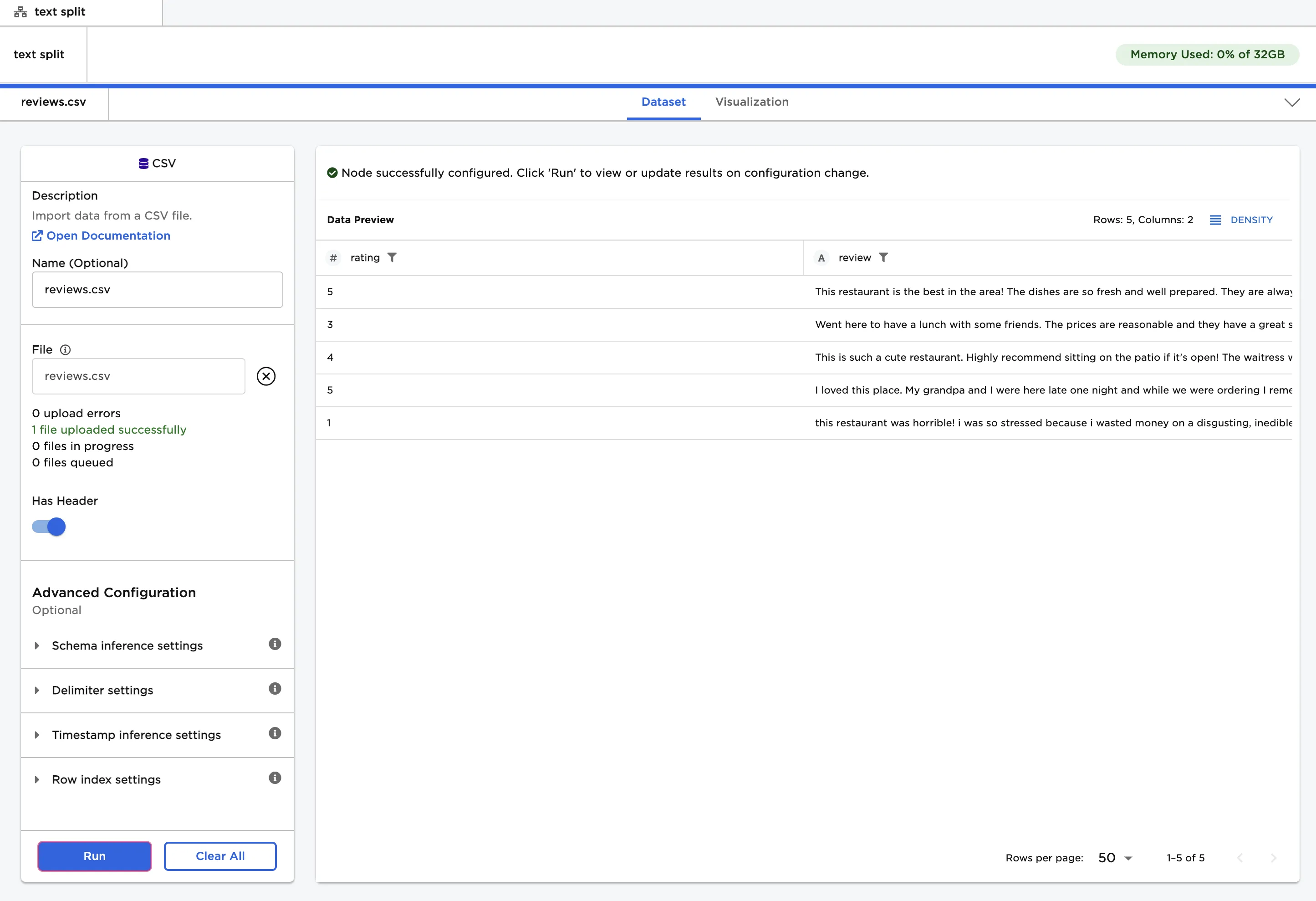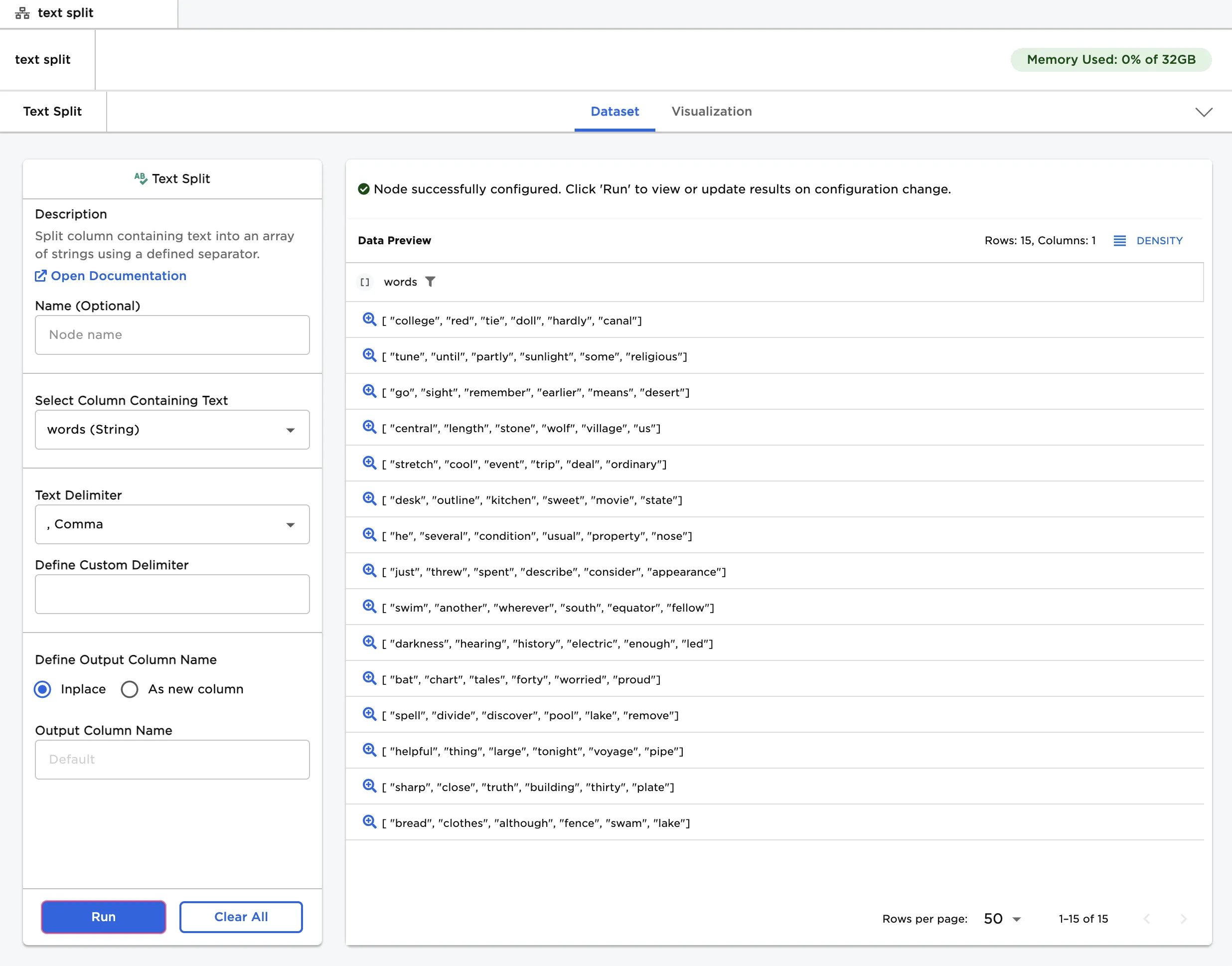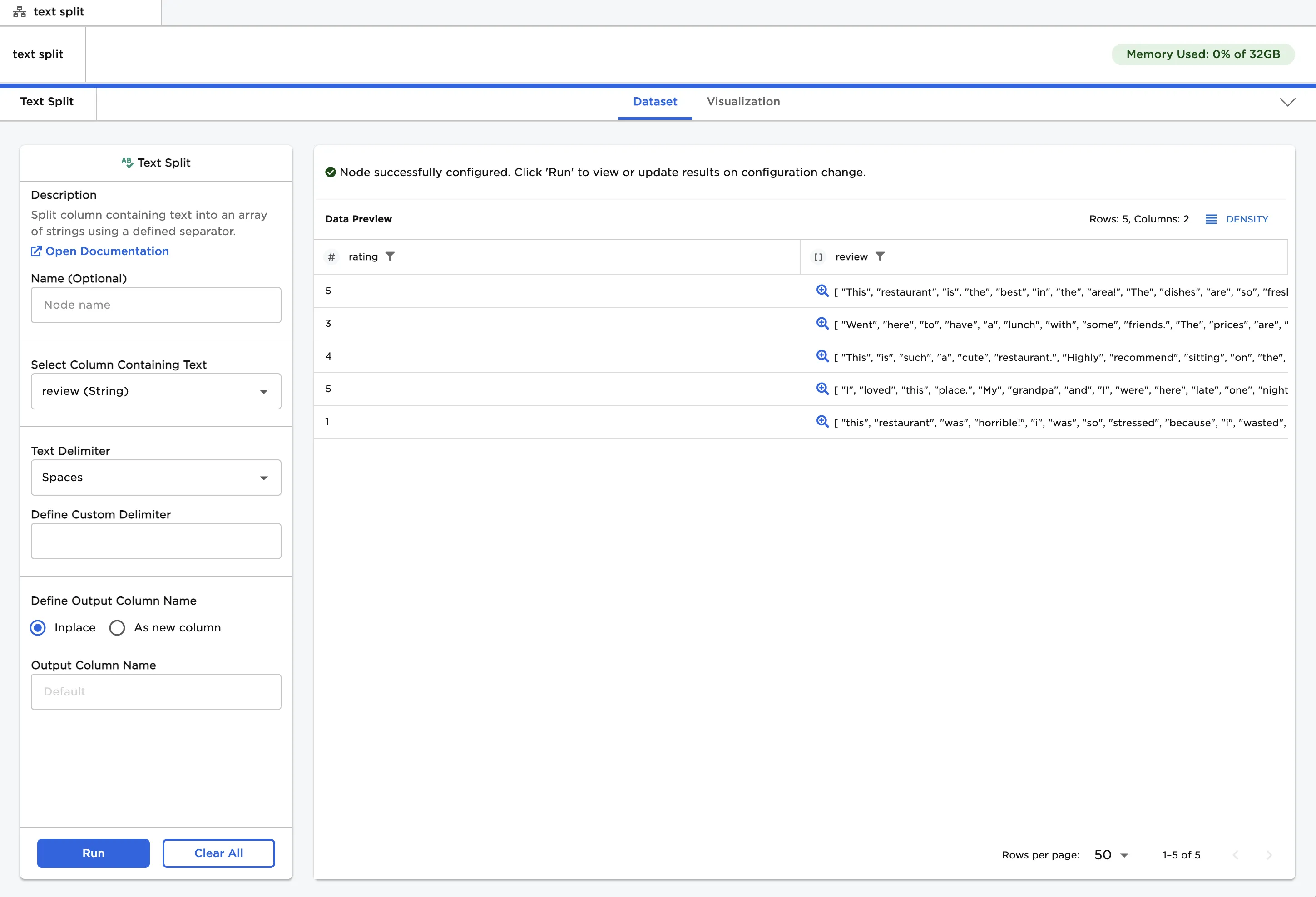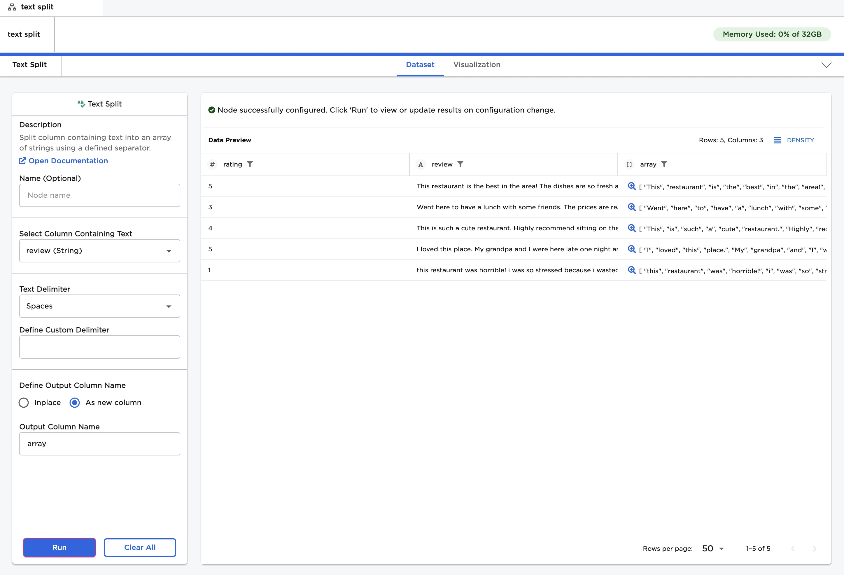 - Select "Run" to replace the "review" column with an array of words.