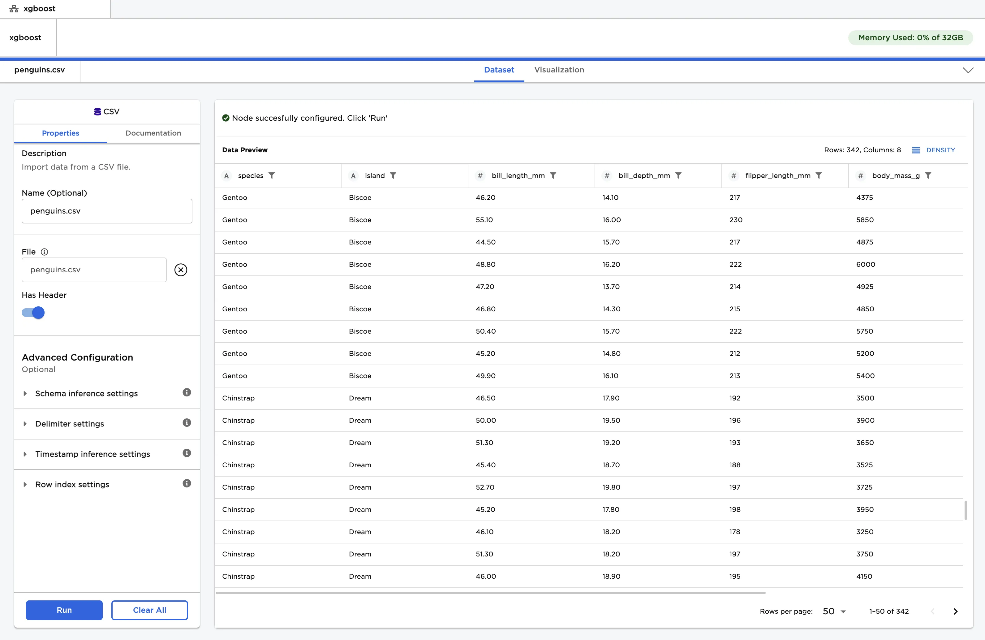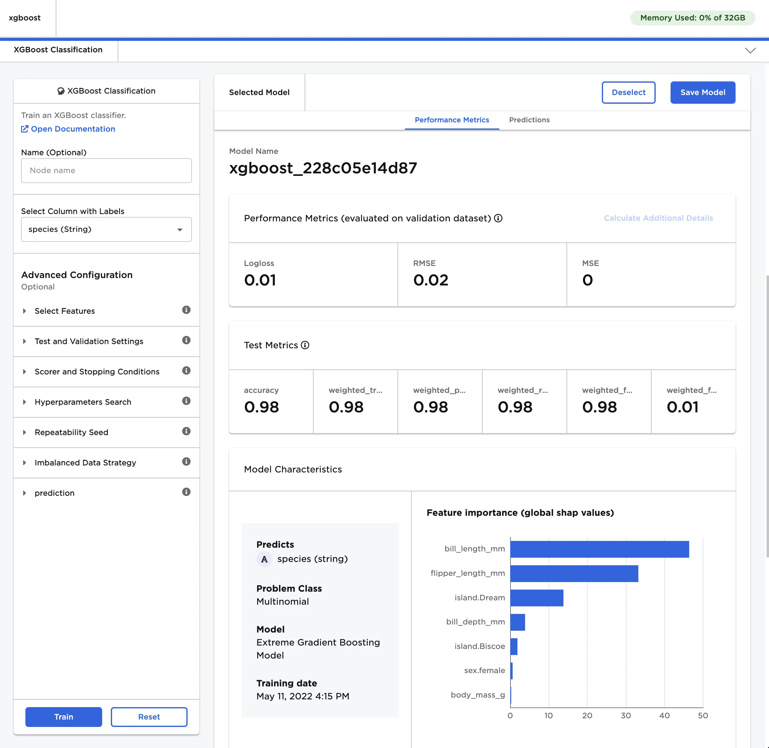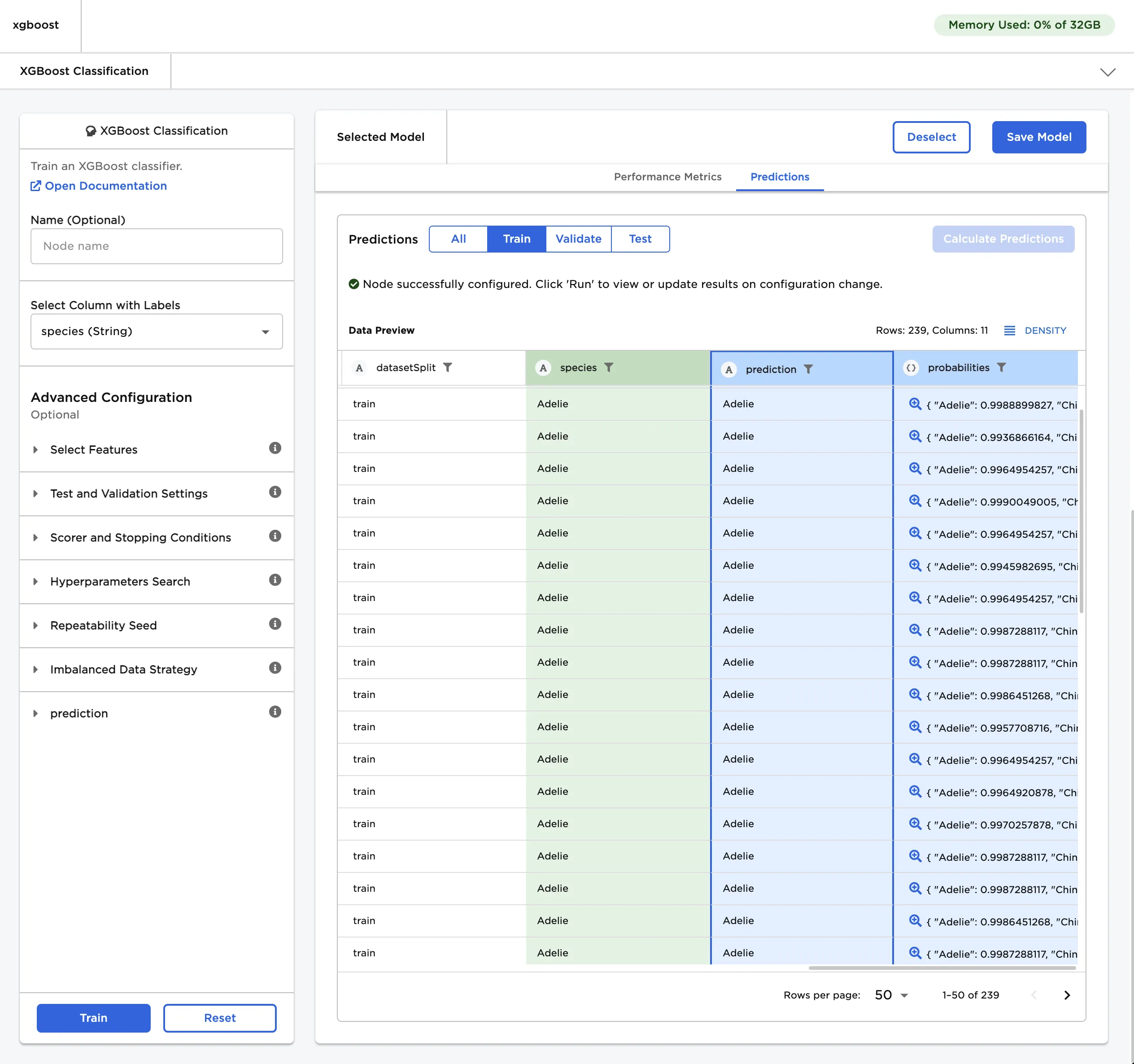 | Select Column with Labels | The column the XGBoost classifier should predict Select a column from the dropdown menu. This column contains the labels that the model should be able to predict after the training. |