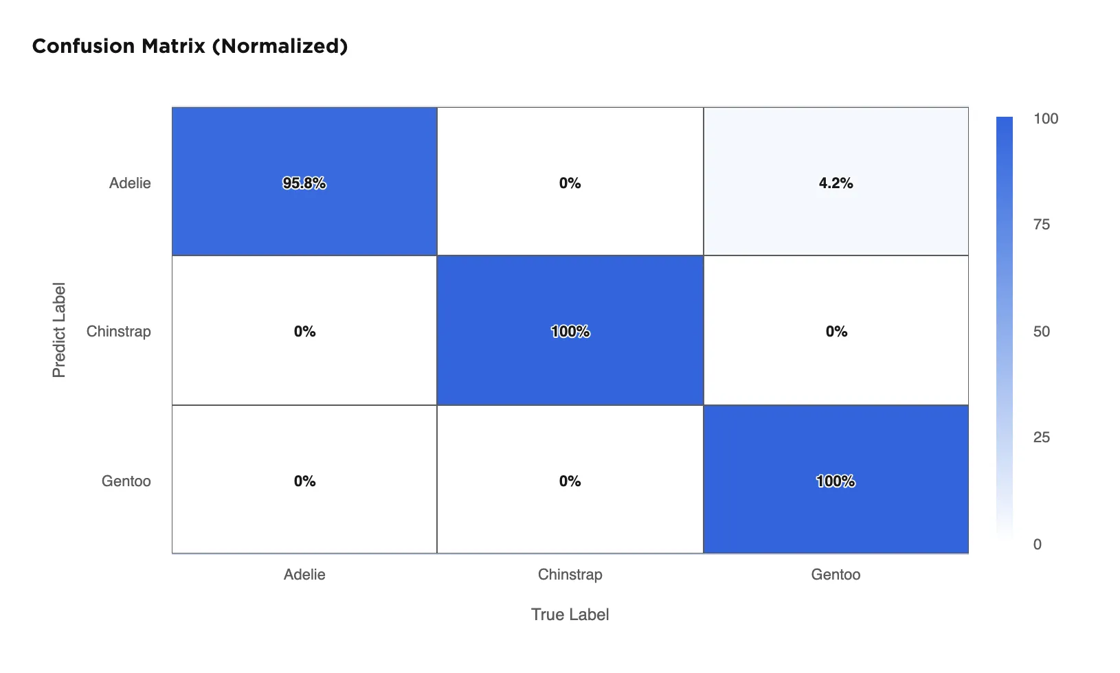 The confusion matrix shows that the selected model correctly identifies all Chinstrap and Gentoo penguins in the data, but only correctly identifies 95.8% of the Adelie penguins. It mistakenly categorizes 4.2% of Adelie penguins as Gentoo penguins. A confusion matrix with a diagonal row of "100%" values from the top left to the bottom right indicates a perfect model.