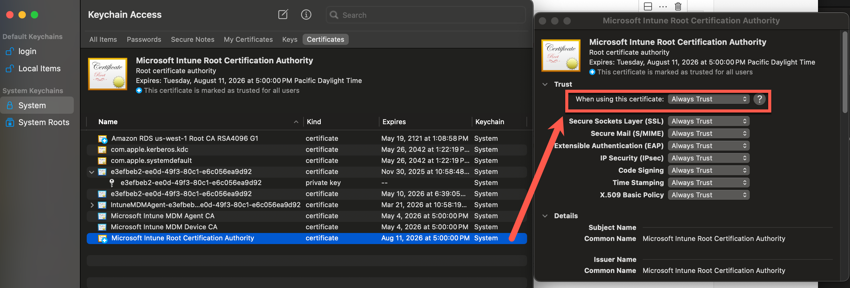 mycert.pemfor each.pemfile you saved.Textsudo security add-trusted-cert -d -r trustRoot -k /Library/Keychains/System.keychain mycert.pemThen open the Keychain Access application and set the When using this certificate: field to Always Trust for each certificate. See the following screenshot for this step: