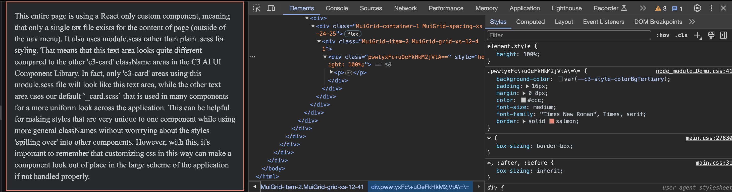 C3 AI Platform's component library comes with detailed and beautiful styling; however, when making custom components, it can be beneficial to ensure that your custom css doesn't affect any other components by accident. For that, you can use *.module.scss files.